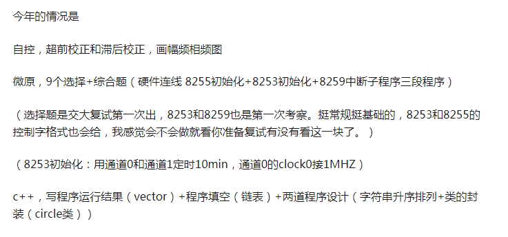 上交的复试一般于三月中下旬进行。初复试比重为500:200,即初试满分五百分,复试满分200分。复试的200分当中,100分是笔试,笔试科目包括自控、微机和 C++,自控和微机各占35分,以大题为主,考纲与816/820相同;C++共30分,一般是3-4道编程小题。卷面难度适中,主要的问题是考试时间100分钟略显紧张。对于复试笔试的准备越早越好,初试结束后休整两周左右就应该开始着手准备复试了。
