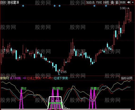 买入时机: IF(CROSS(J,3),65,0),COLORFF00FF,LINETHICK3;