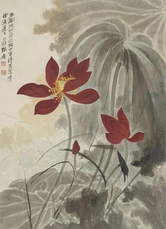 徐悲鸿在《张大千画集》序中说:“大千代表山水作家,其清丽雅逸之笔,实令人神往。”张大千以擅长画荷花著称,素有“古今画荷的登峰造极”之誉,在众多花卉题材中,张大千偏爱荷花。张大千早年画荷花,画法多以明代画家徐渭画法为多,中年时是半工半写者多,到了晚年最擅长以泼彩半抽象手法来画荷花。