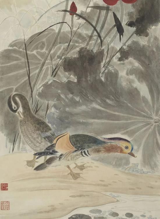 此图下方画一水塘,水面上浮动浮萍与团团荷叶,在空白处顺势以花青勾勒水纹,水波涟涟,气氛静谧。然后画家用不同深浅的赭石画出坡岸,在坡岸上立着一对鸳鸯,一只向水而立,目光炯炯,似乎注意到了水面的动静,另一只则背立另侧,自顾自的梳理羽毛。