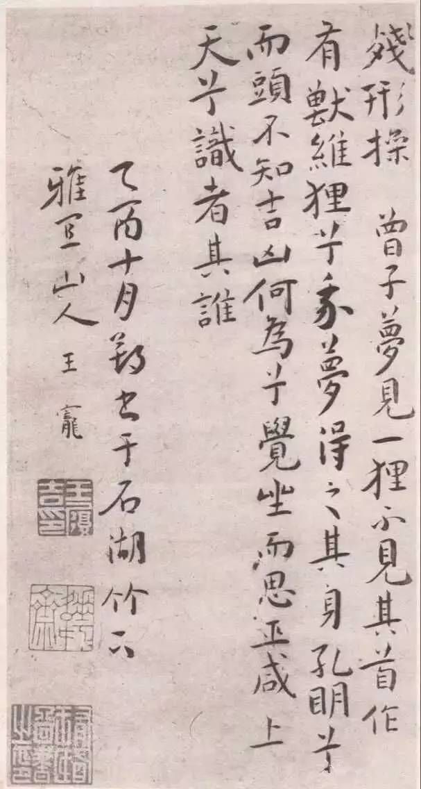 王宠的这本小楷册录孔子、周公《龟山操》、《岐山操》等共十首,书于嘉靖乙酉(1525年),时年32岁。王宠于十月朔日用金栗山藏经纸书写,内容为韩愈作仿古《琴操》曲十首,此迹落款「乙酉十月朔,书于石湖竹下,雅宜山人王宠」,钤「王履吉印」、「韡韡斋」二印。
