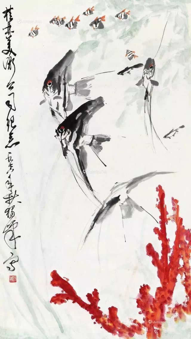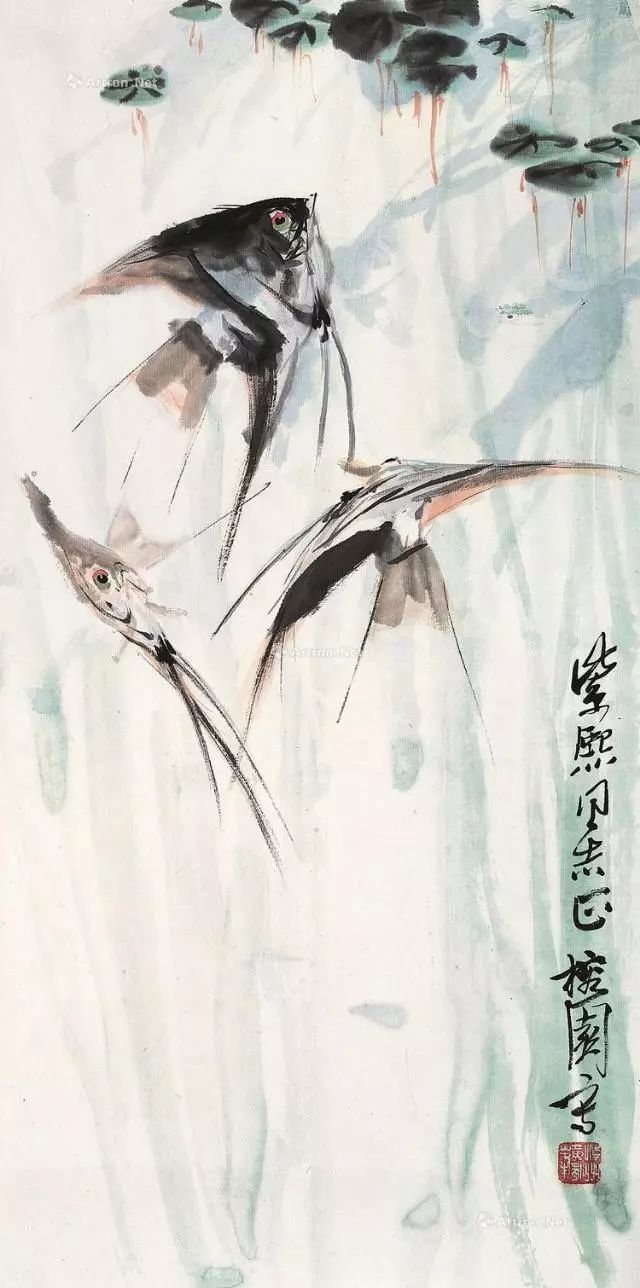 他笔下的“神仙鱼”,飘逸灵动、水墨淋漓、富于变化又浑然一体。在独树一帜方面相当于悲鸿马、白石虾、黄胄驴。