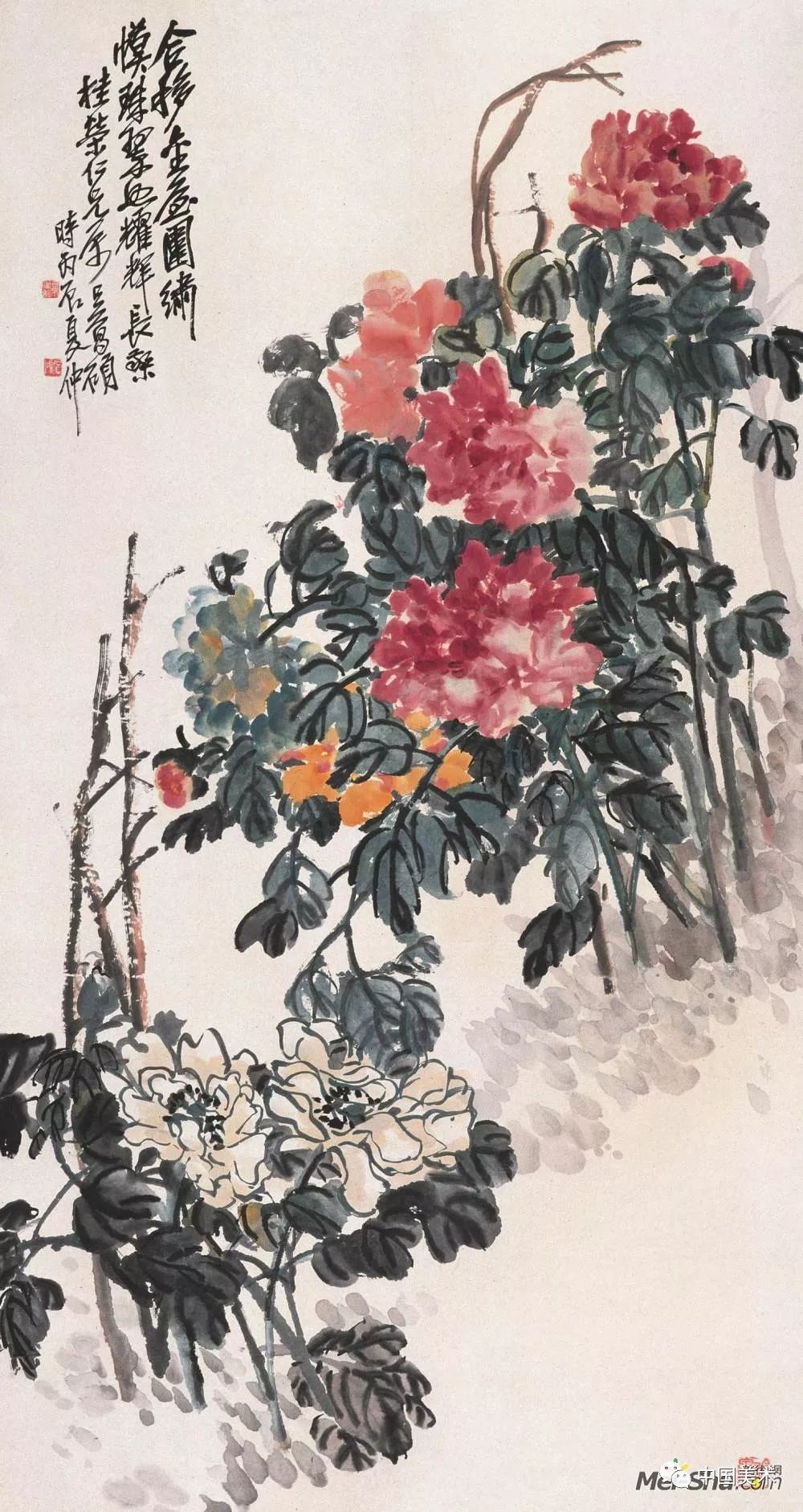 《五色牡丹》 吴昌硕 1916年 148.3×80.6厘米 纸本水墨设色