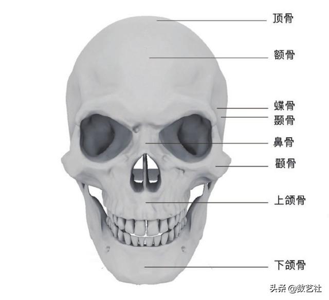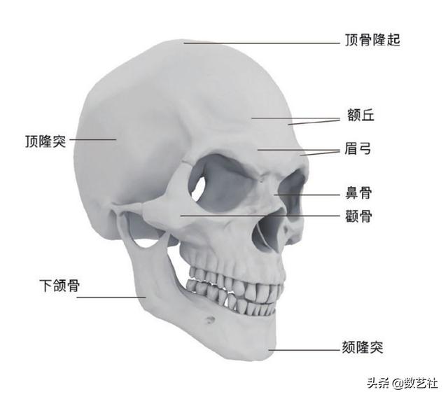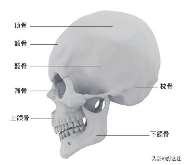 头部骨骼分为脑颅和面颅两部分,脑颅呈卵圆形,占头部的1/3,面颅约占头部2/3。头骨的形状决定了头部的外形特征,具有差异性,例如性别差异、年龄差异、个性差异等。下图是不同视角头骨结构的示意图。