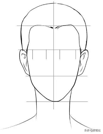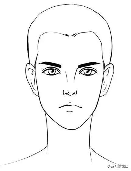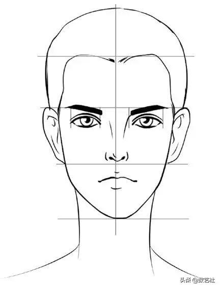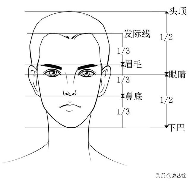 男性的脸形偏直线感,下巴较方。右图是男性正面五官基本比例分析图。