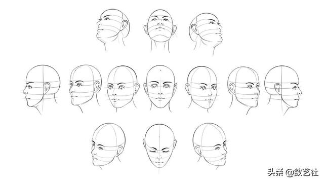 透视是头部表现的难点,不同角度的头部练习有利于把握透视变化。绘制时注意确定头部中线和五官辅助线,把握头部的运动规律,还要注意近大远小、近高远低的变化。