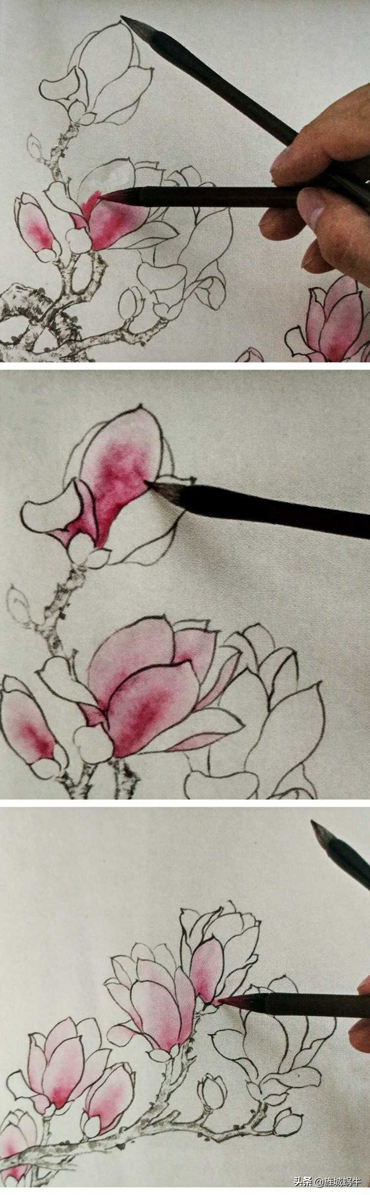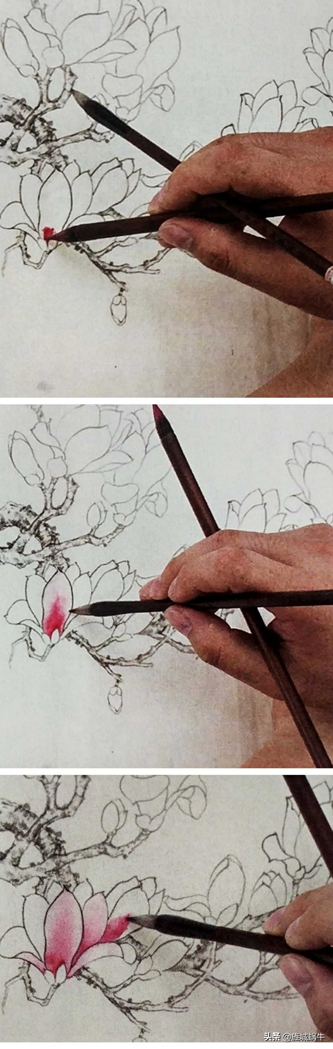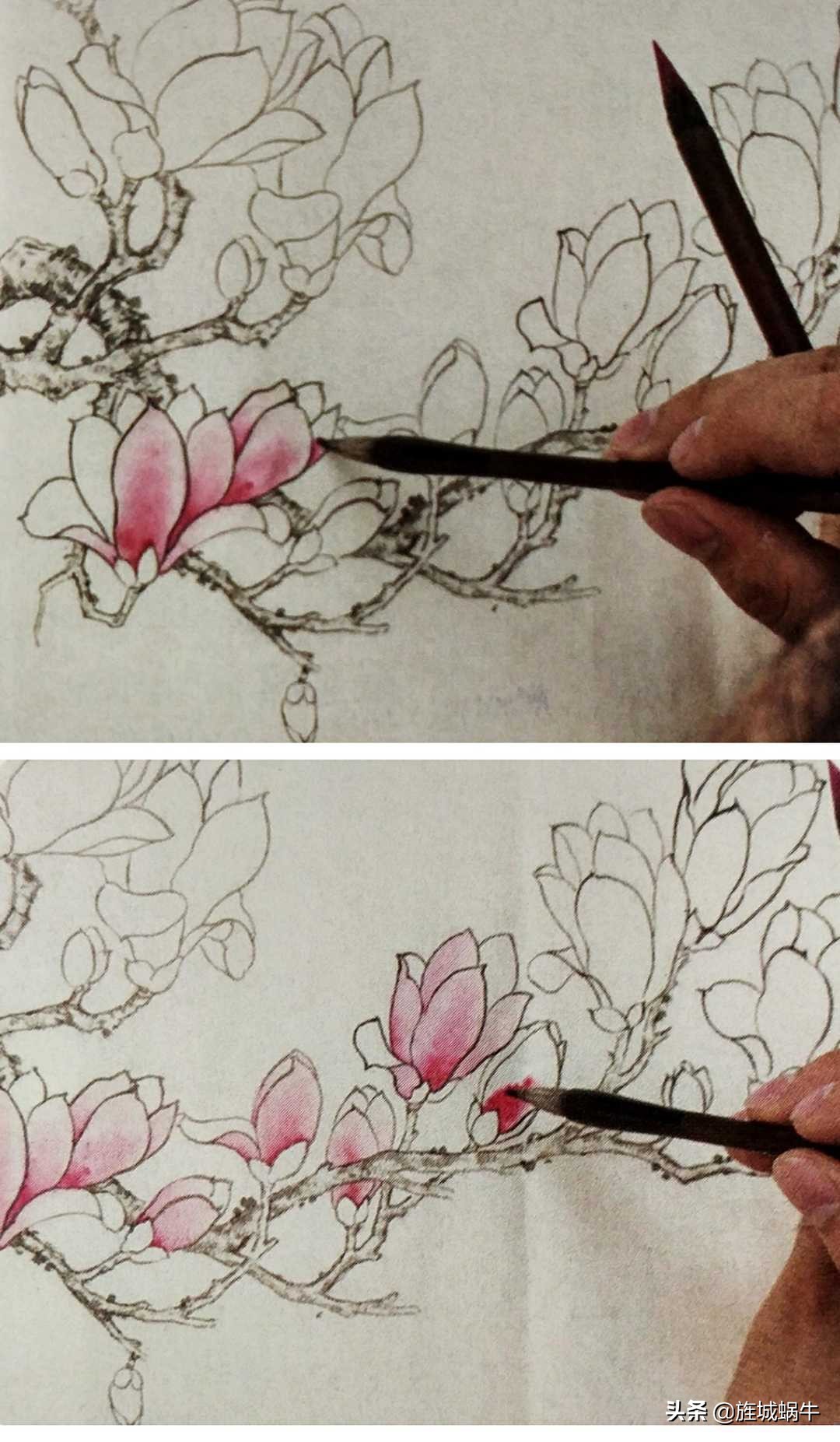 第一步:选用中号白云笔调曙红,对画面前面的玉兰花的花瓣进行分染,然后换干净的笔蘸清水晕染开来。