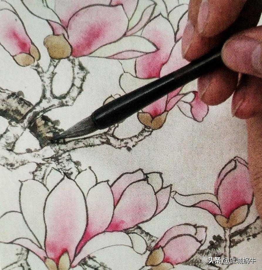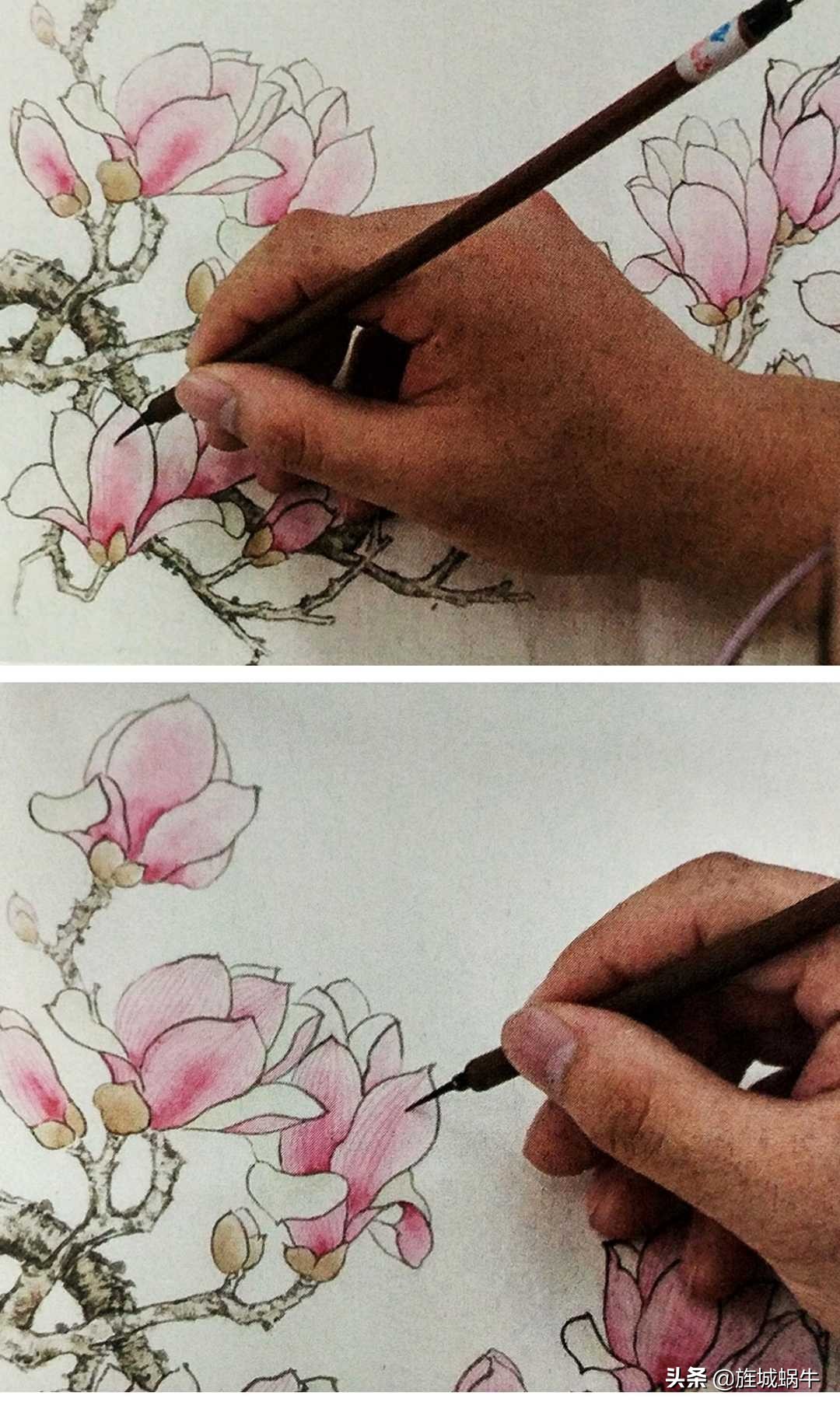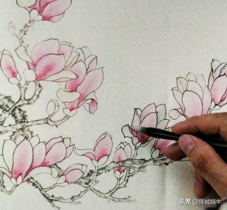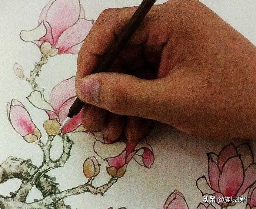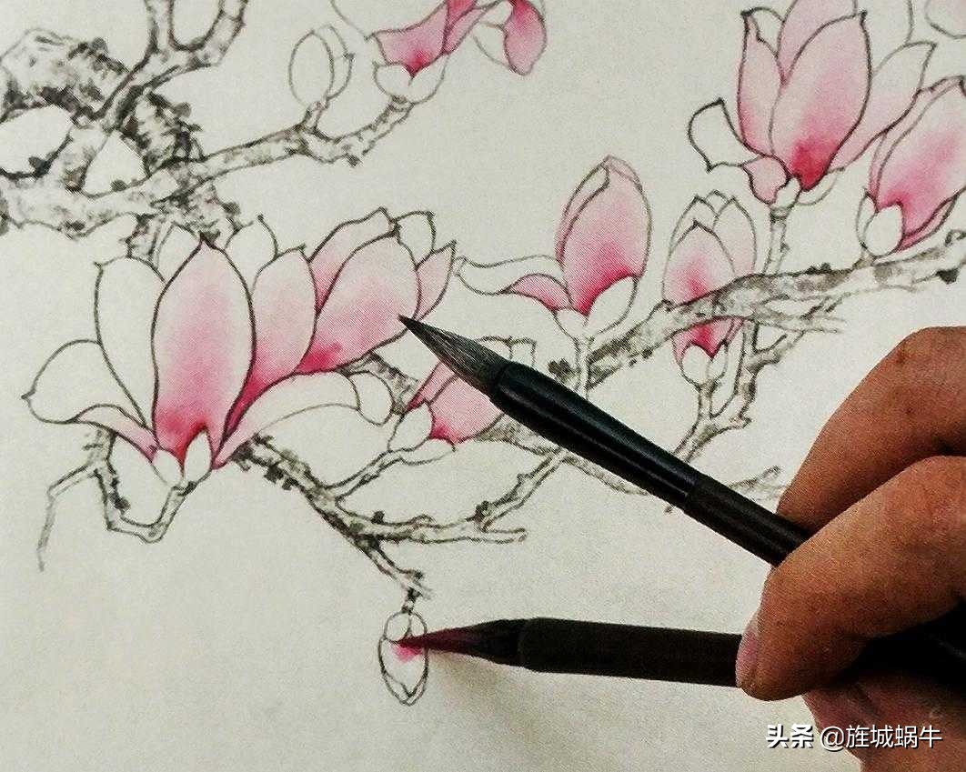 第一步:选用中号白云笔调曙红,对画面前面的玉兰花的花瓣进行分染,然后换干净的笔蘸清水晕染开来。