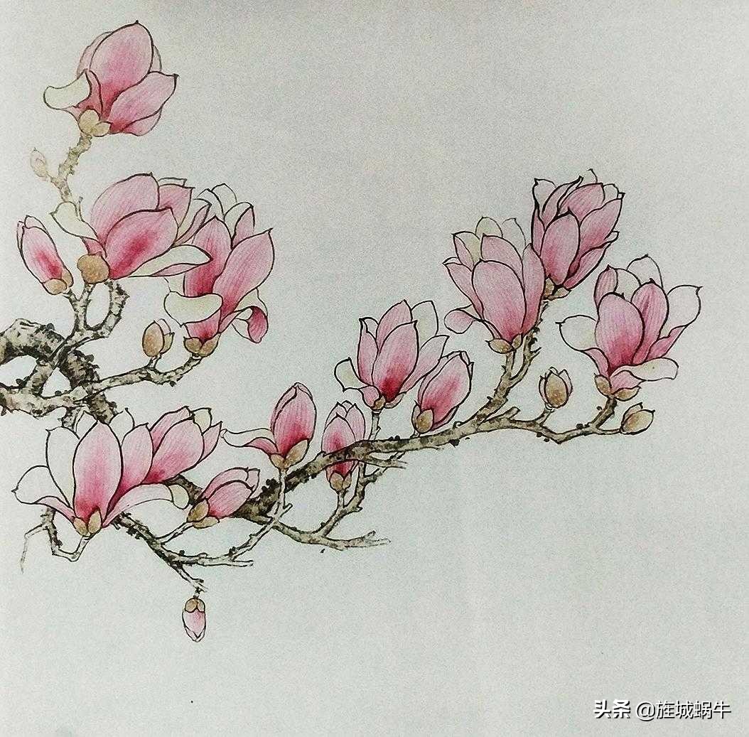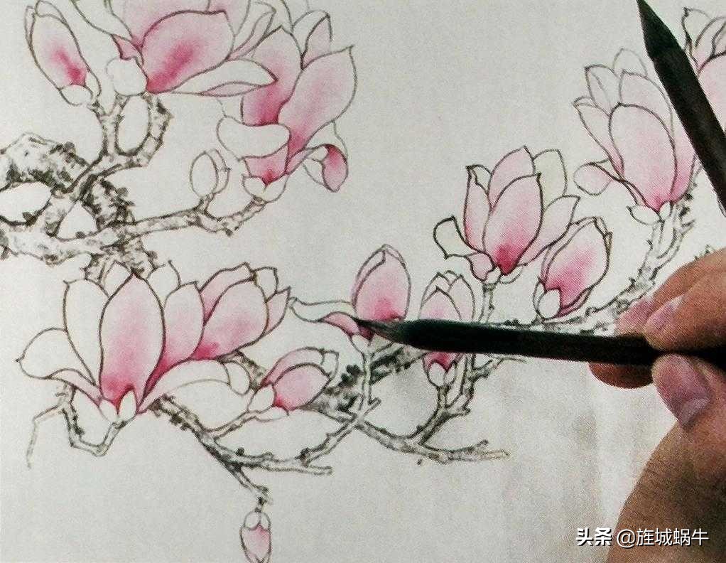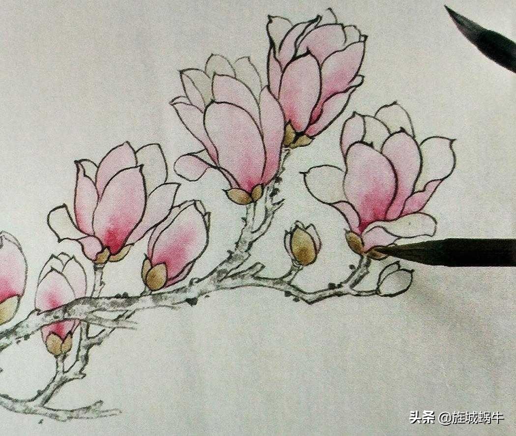 第三步:蘸曙红,对画面后面的玉兰花进行分染,用清水笔晕染开来,过渡处理要自然。