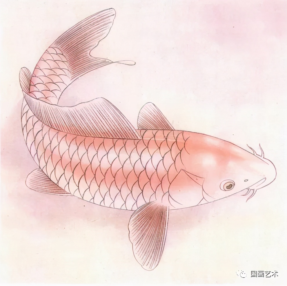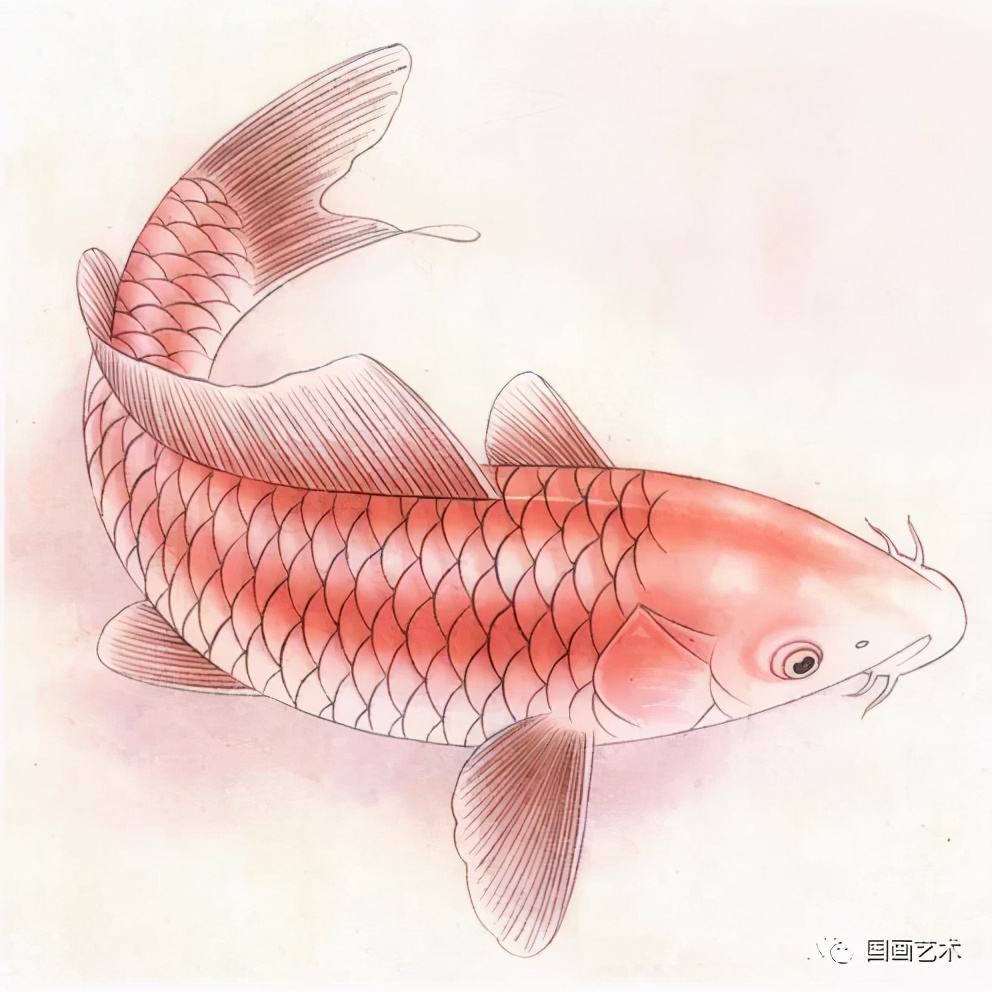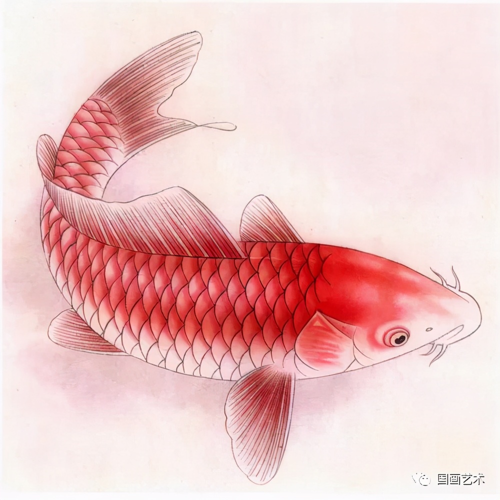 步骤四:用大红画鱼鳞,根据鱼鳞的纵横排列薄而淡地多次分染,逐渐加深,过渡要自然,不要染腹部。加深鱼头的颜色,分染鱼鳍和鱼鳃。↓↓↓