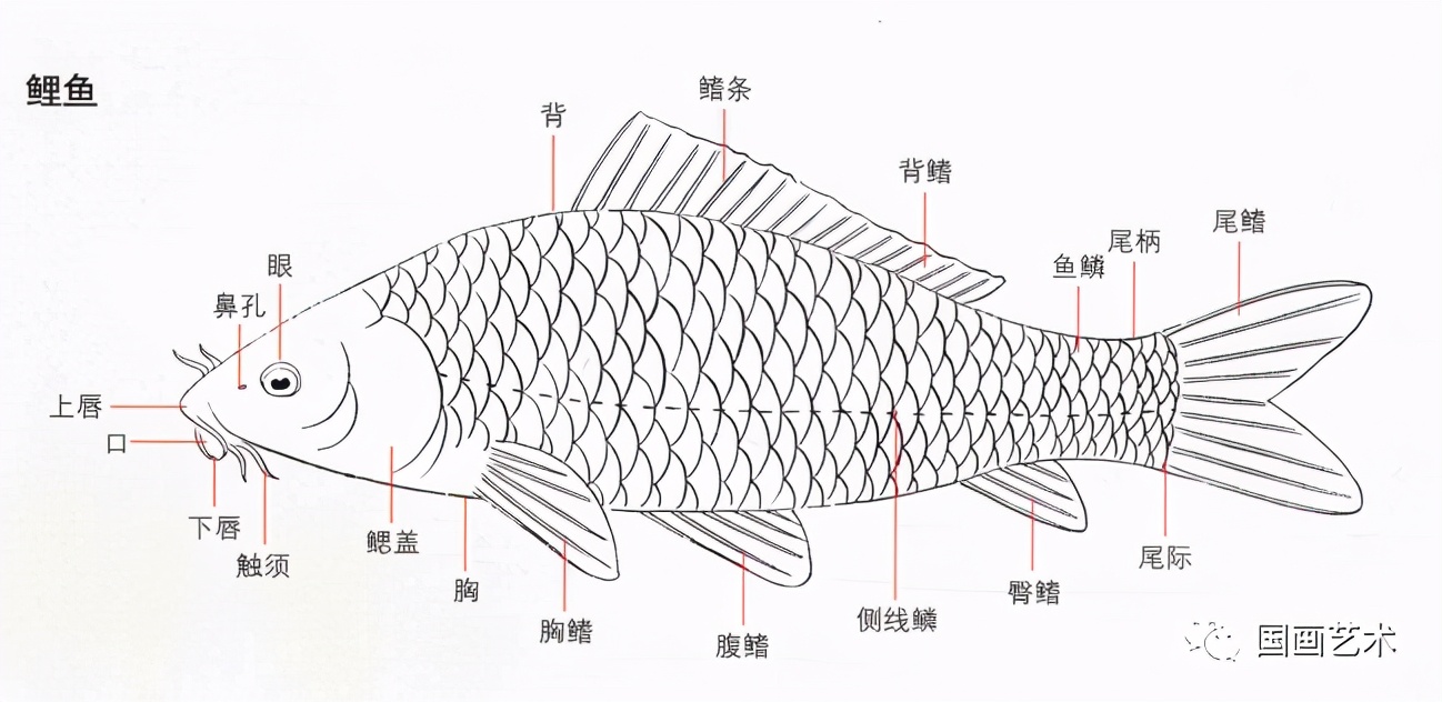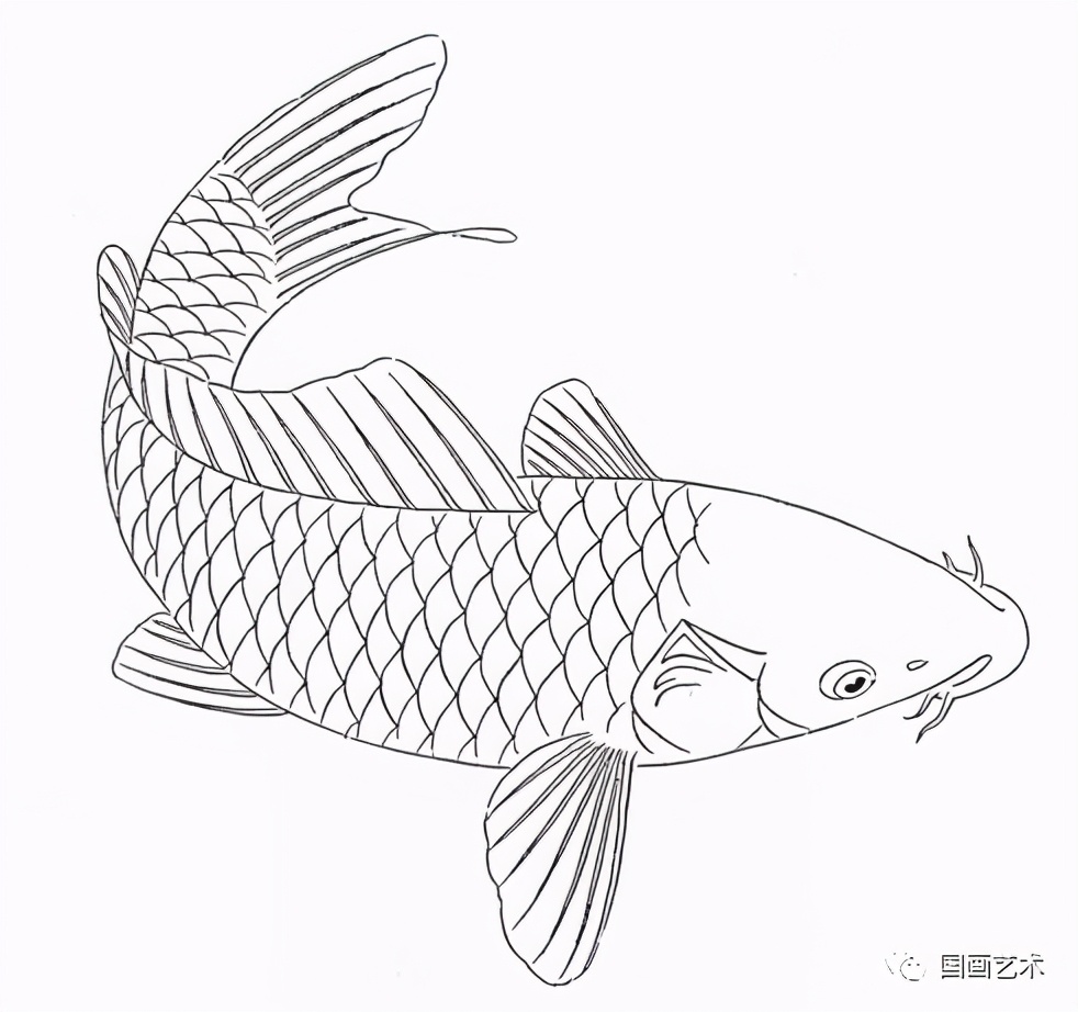 步骤一:用淡墨勾线。先勾轮廓,再勾鱼鳞。勾线造型要准确、自然灵动,注意虚实的变化,勾出鲤鱼在水中的感觉。(为方便学习,本图均印成重置,画时请注意。)↓↓↓