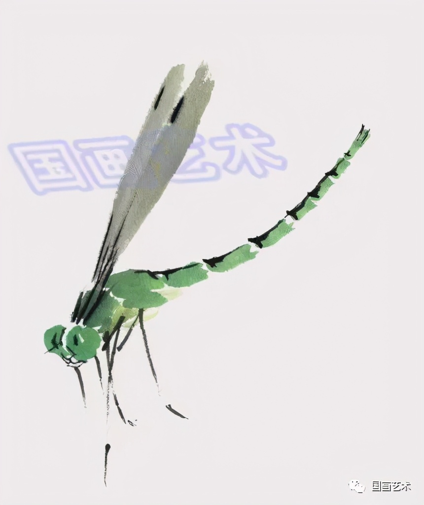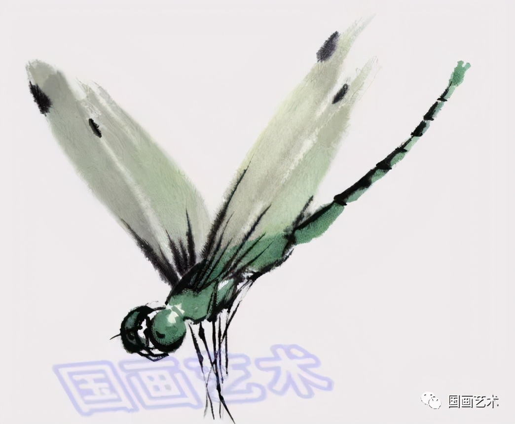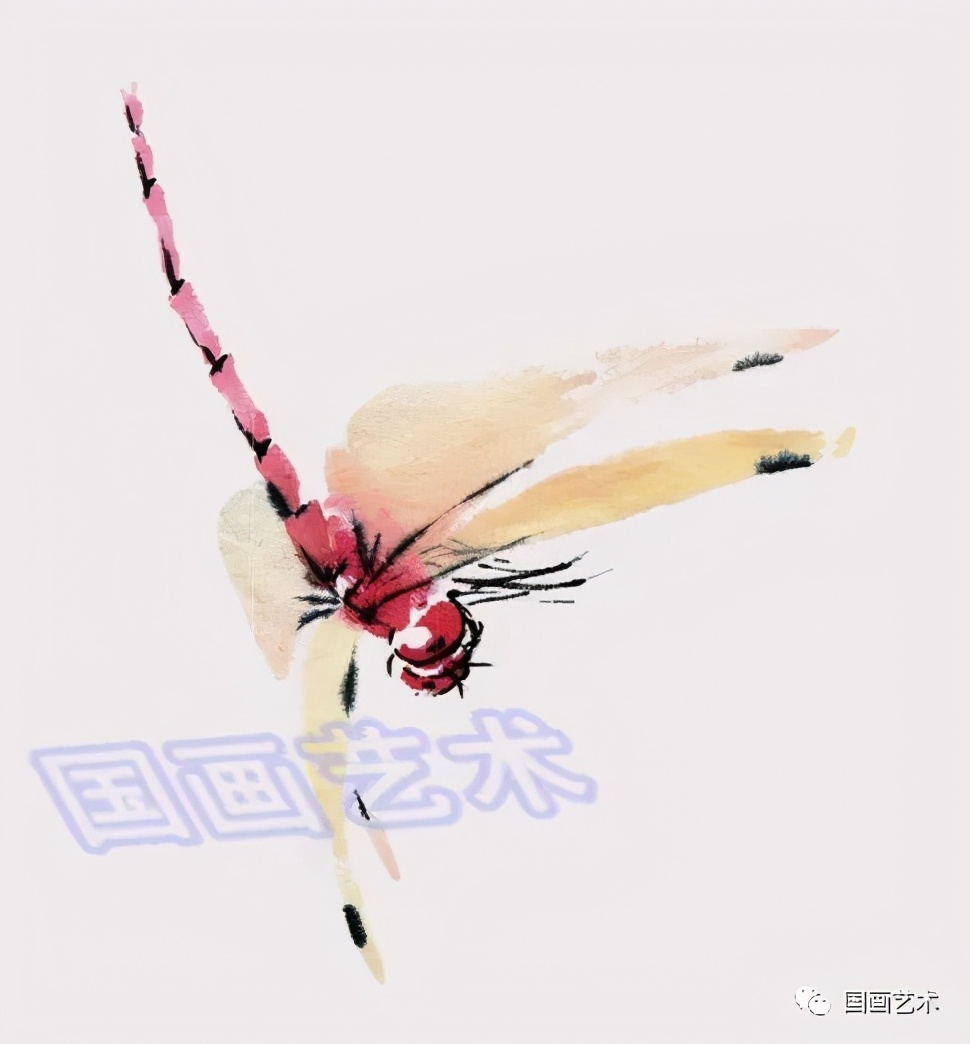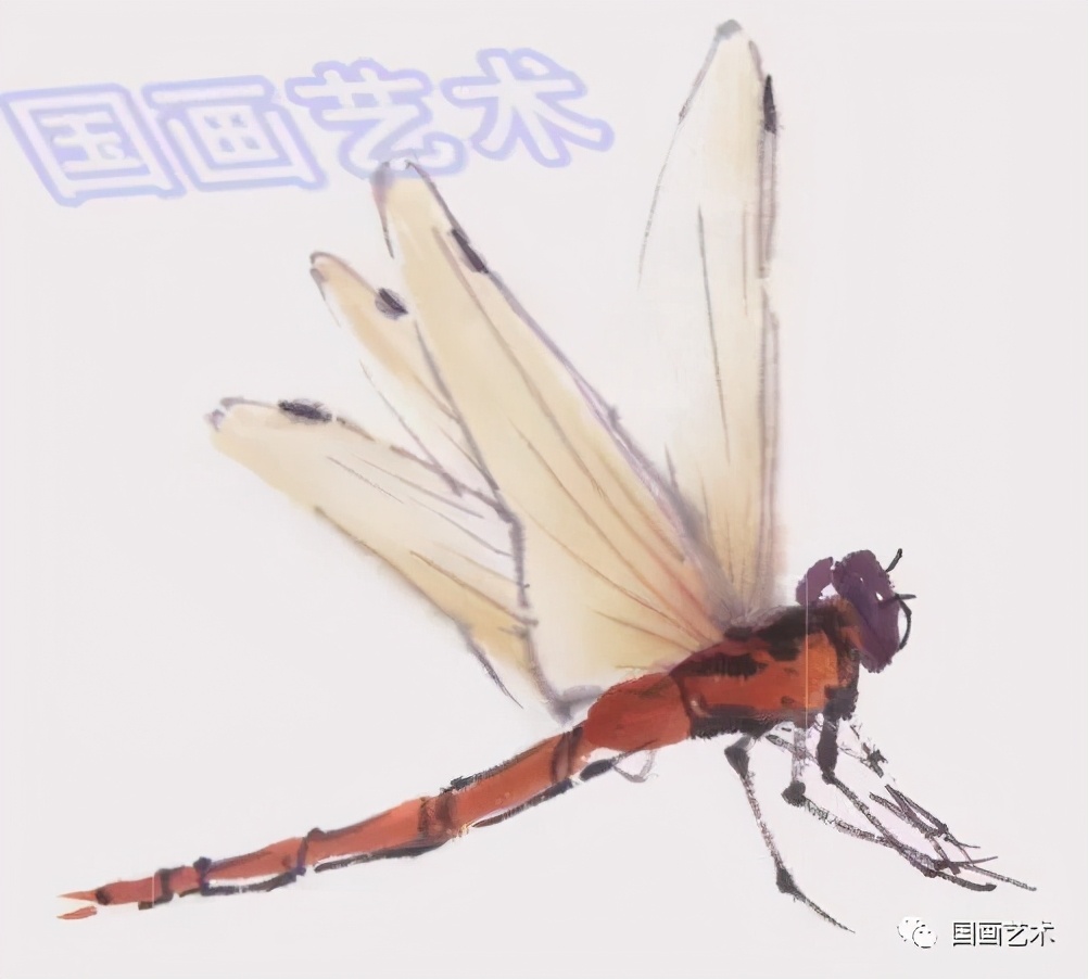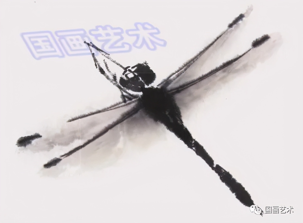 蘸取浓墨,为翅膀点画翅痣。中锋绘制蜻蜓脚及翅膀上的脉络。再细化胸、腹部,完成蜻蜓的绘制。↓↓↓