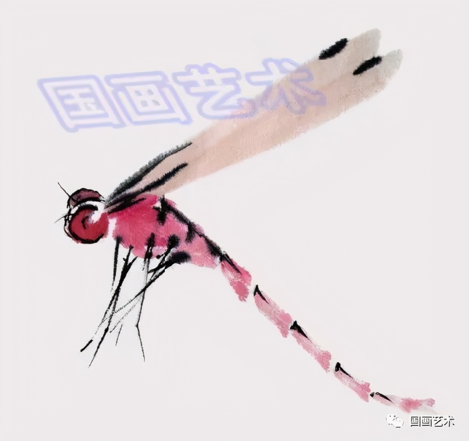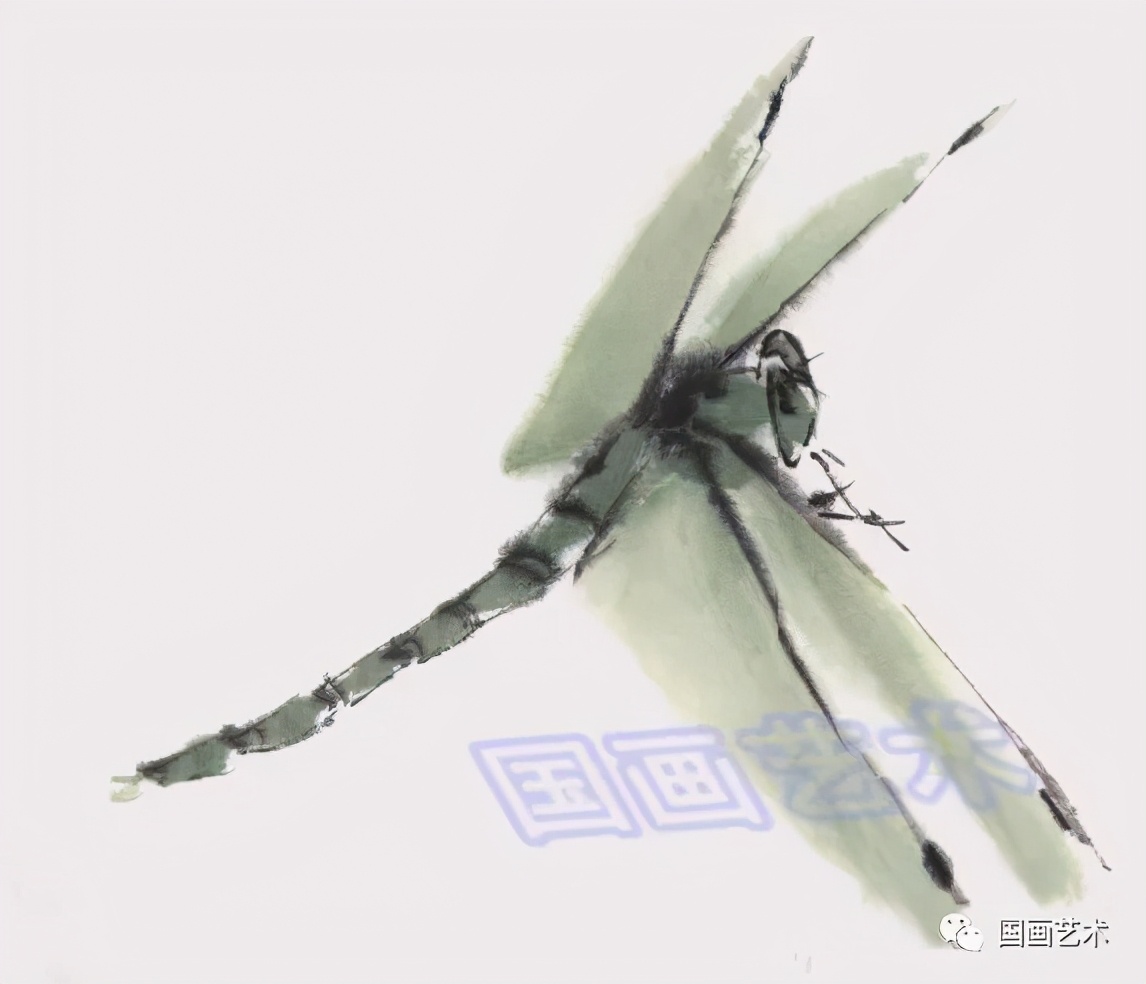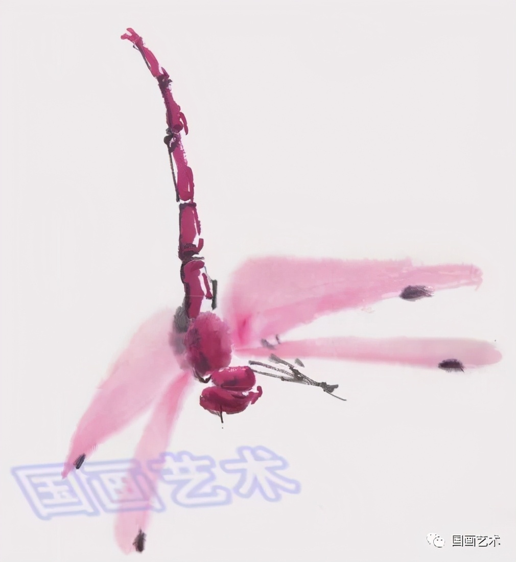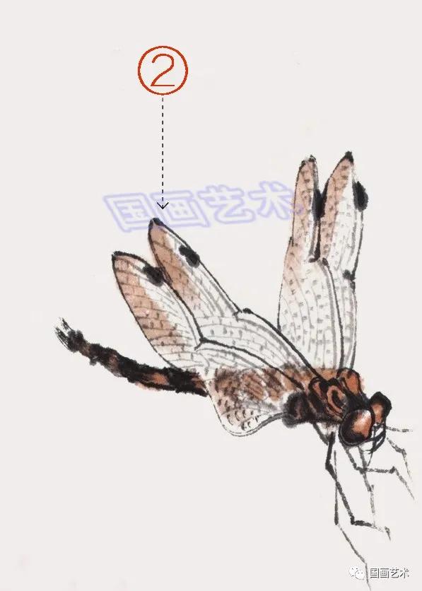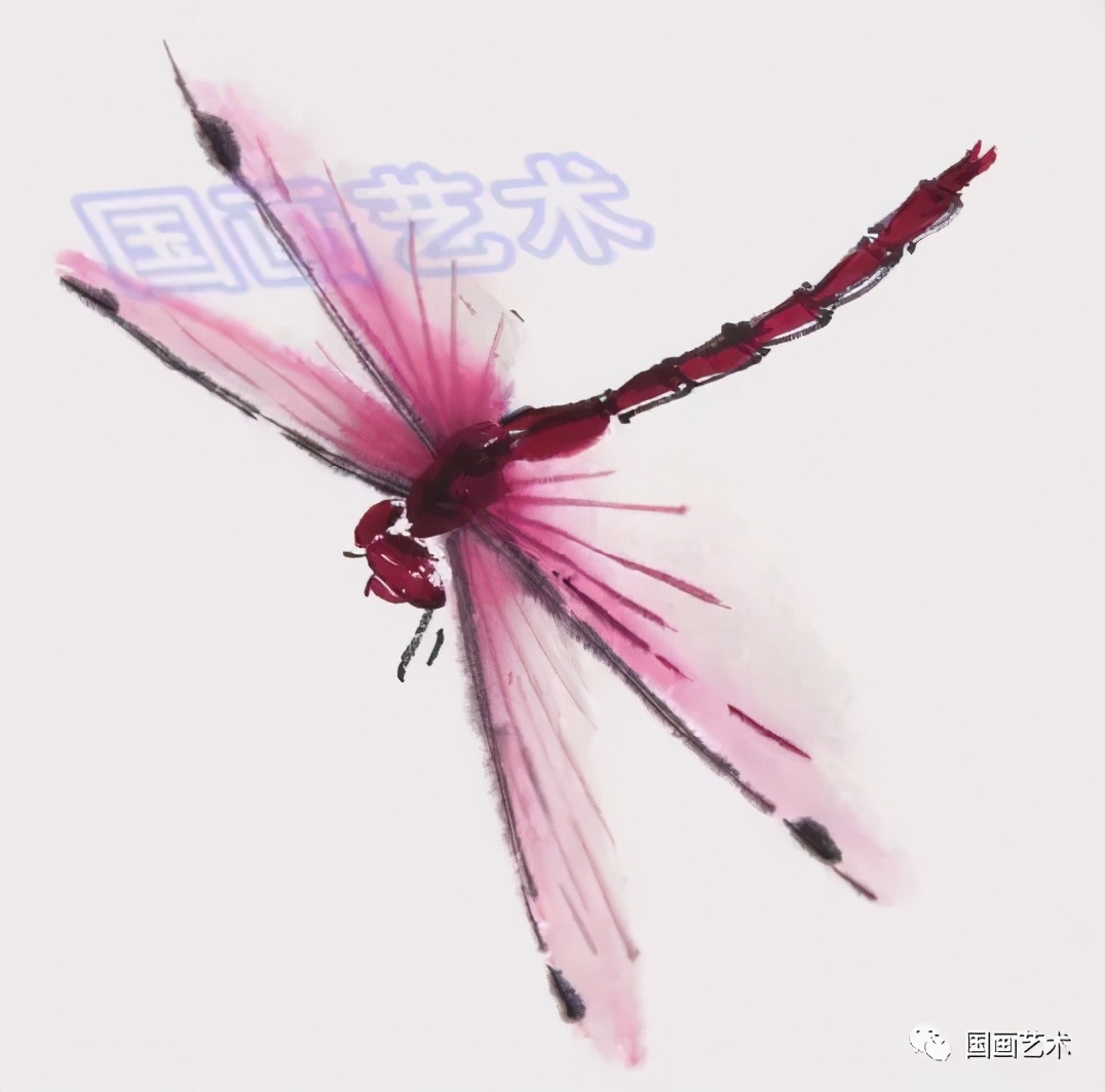 蘸取浓墨,为翅膀点画翅痣。中锋绘制蜻蜓脚及翅膀上的脉络。再细化胸、腹部,完成蜻蜓的绘制。↓↓↓