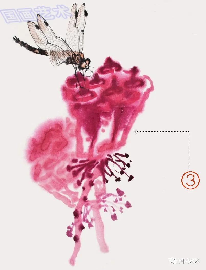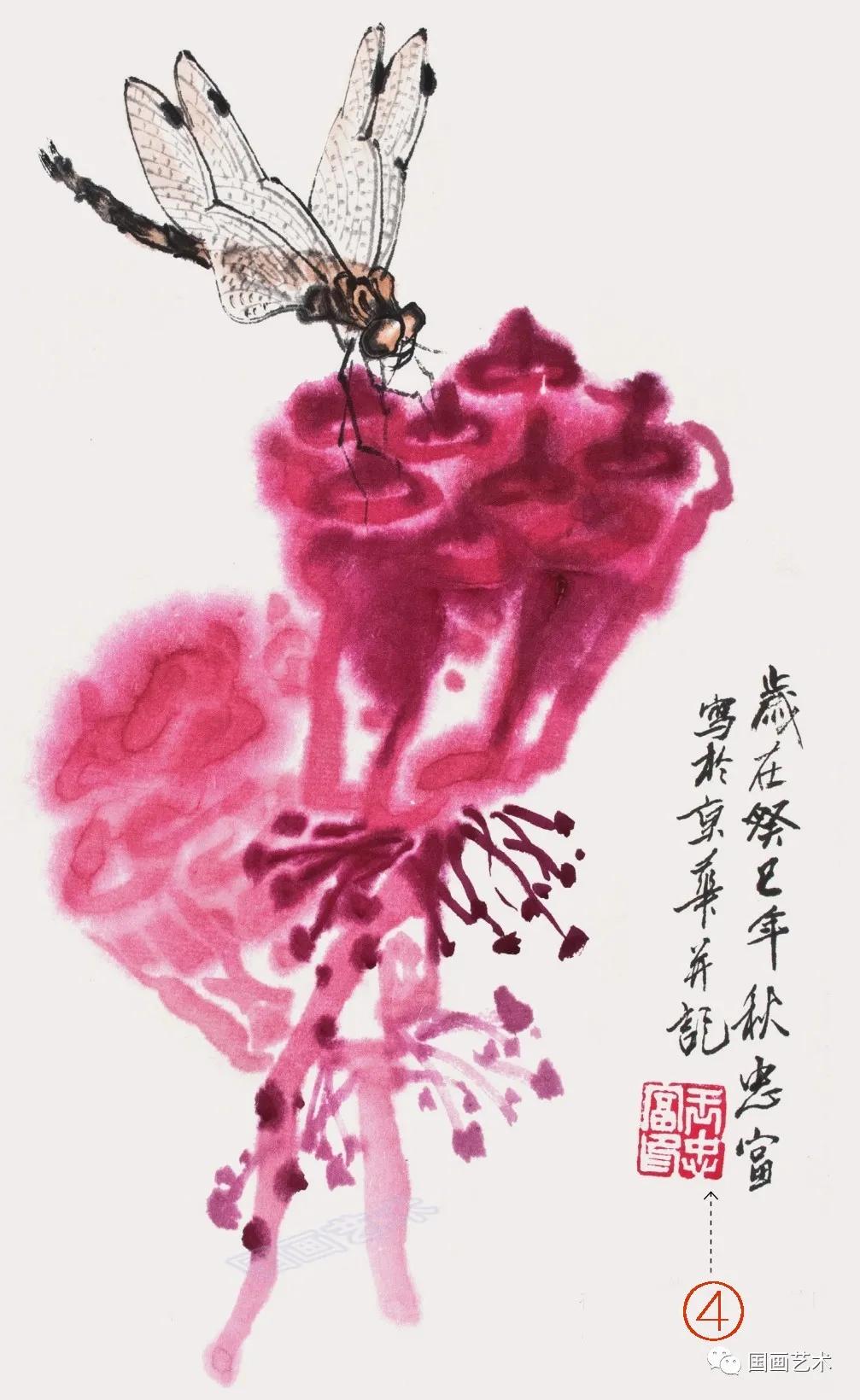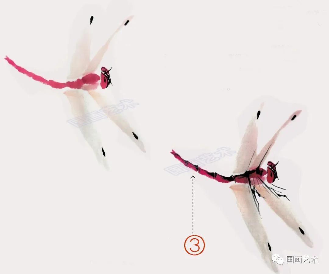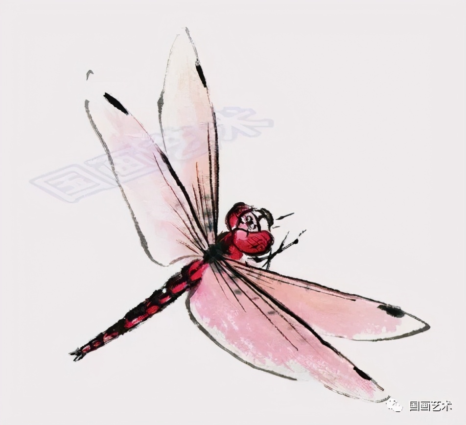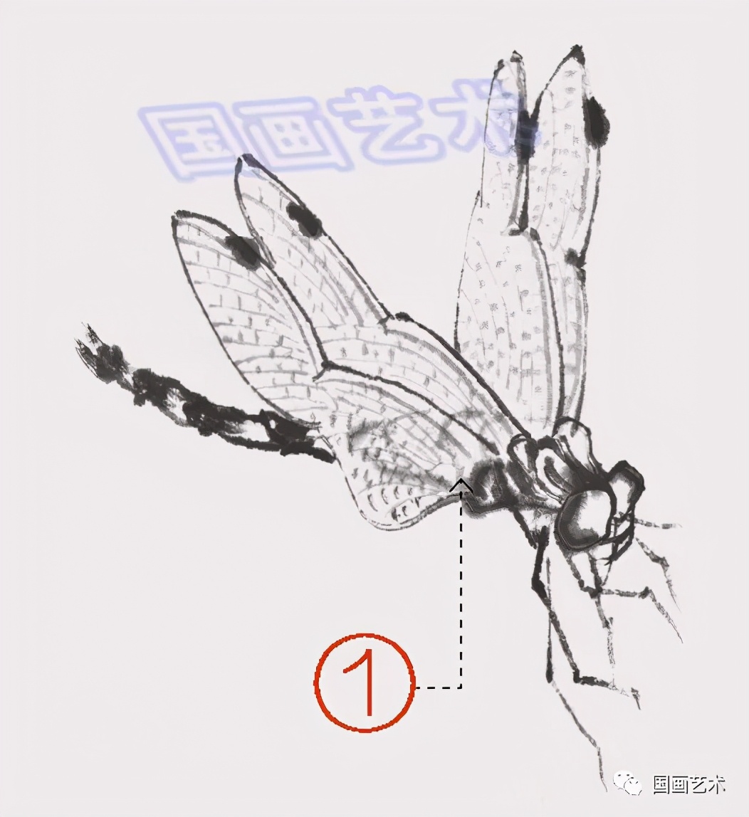蘸取浓墨,为翅膀点画翅痣。中锋绘制蜻蜓脚及翅膀上的脉络。再细化胸、腹部,完成蜻蜓的绘制。↓↓↓