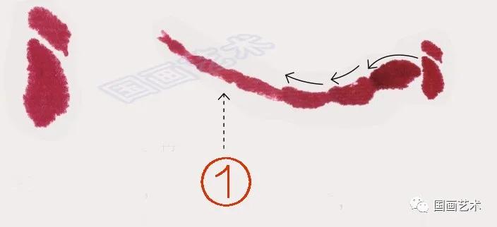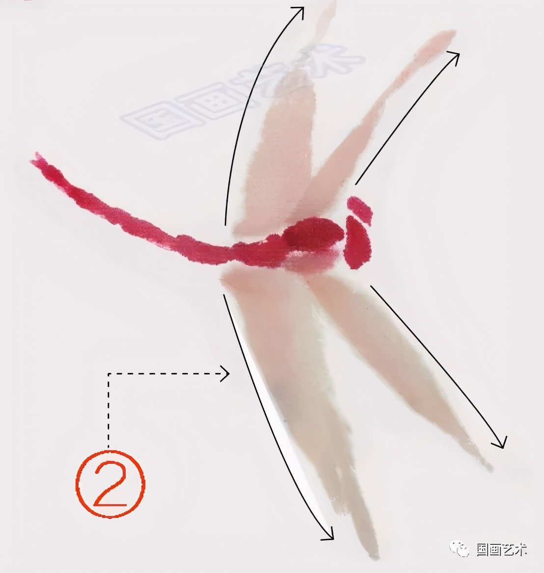 选小号狼毫笔,蘸取曙红加适量清水调各,点厾蜻蜓的头部。再中、侧锋用笔,画出蜻蜓细长的胸、腹部位。↓↓↓