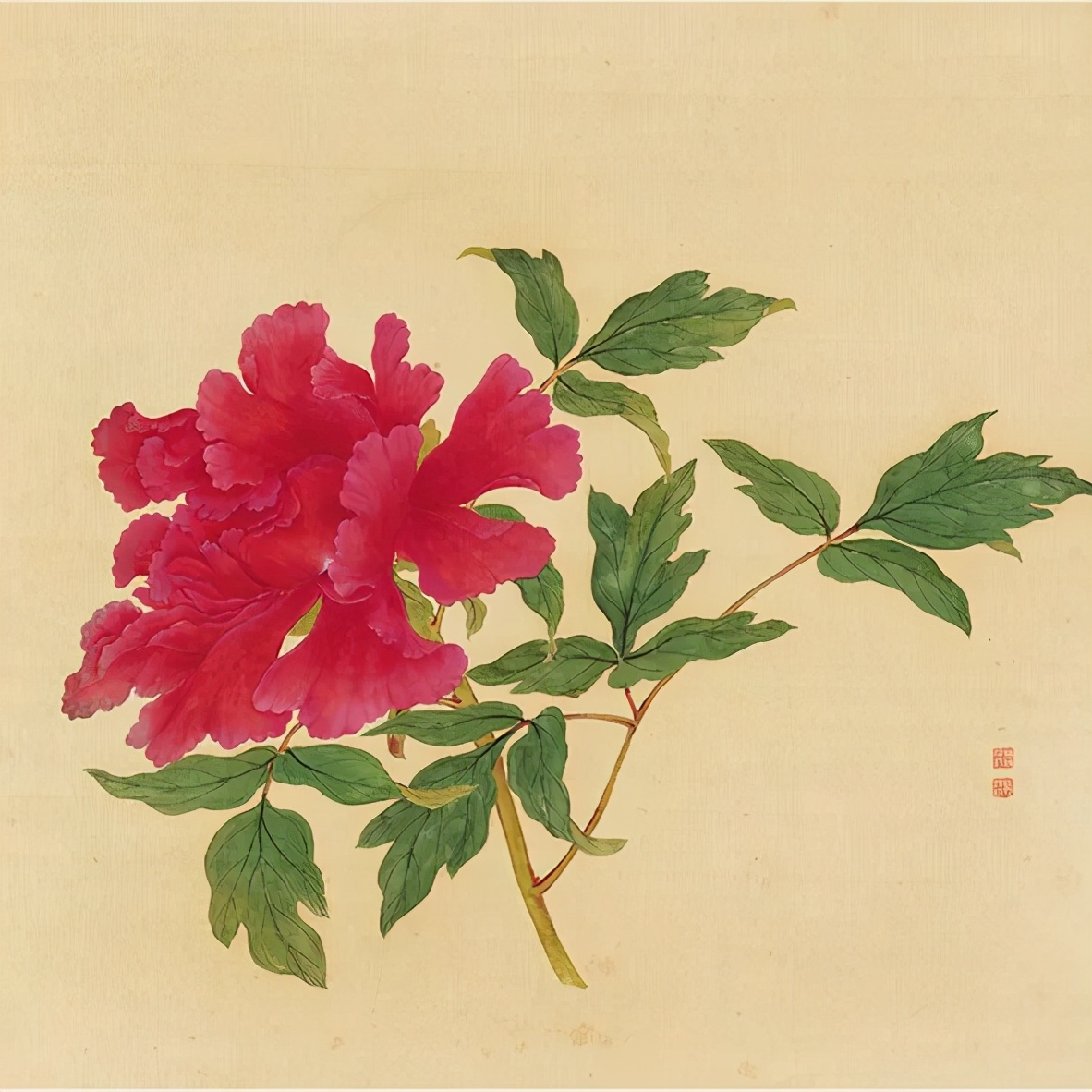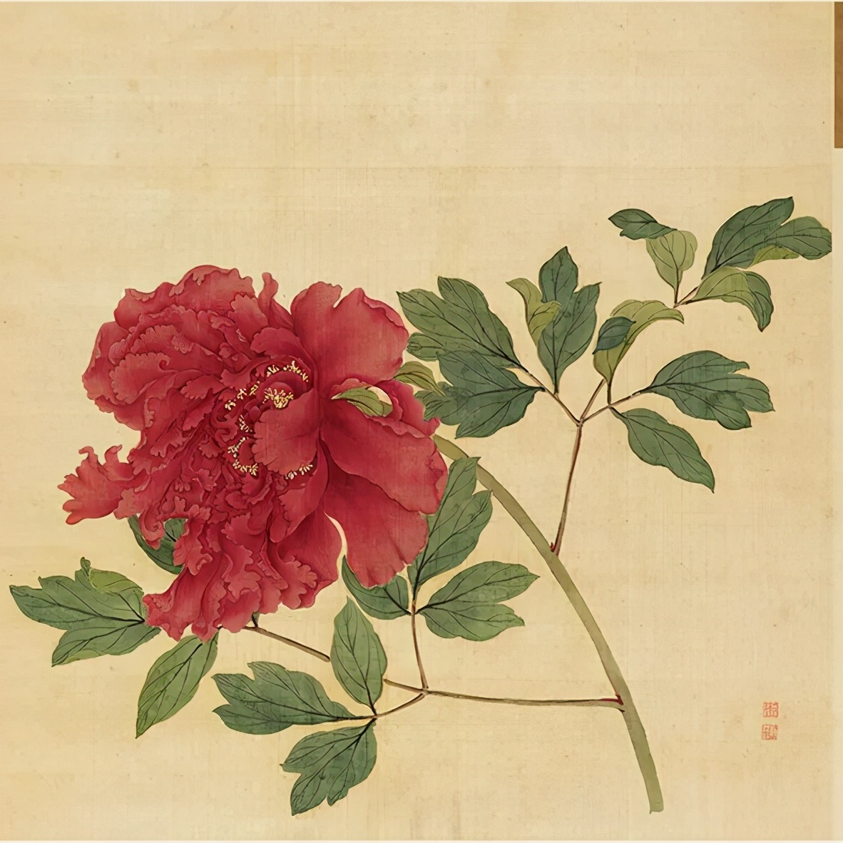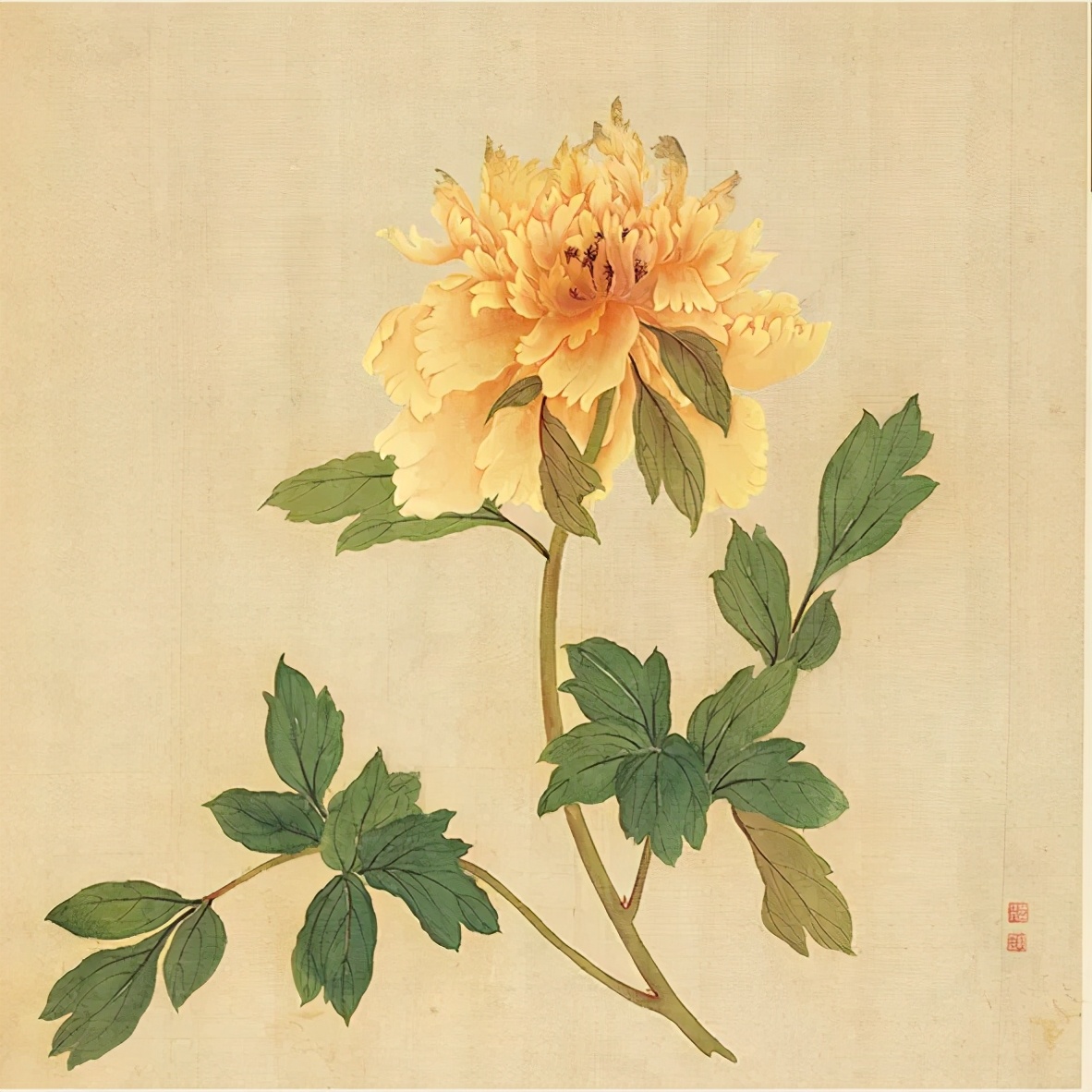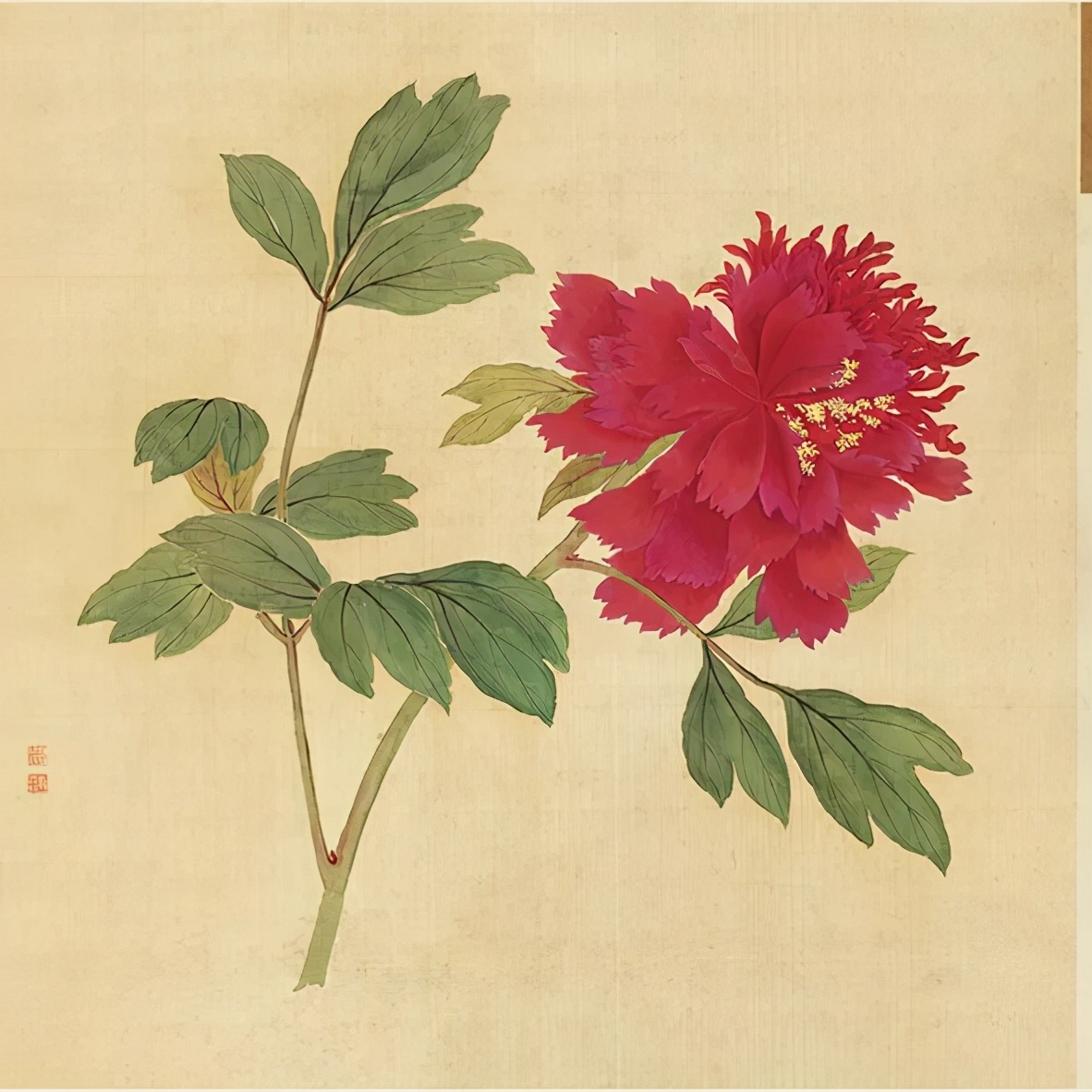 牡丹叶多为没骨法,色彩调和好之后用笔以此勾染而成,等画面干了再用线去勾勒茎脉部分。