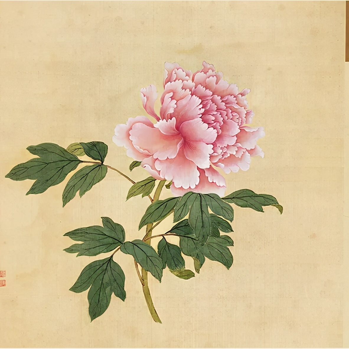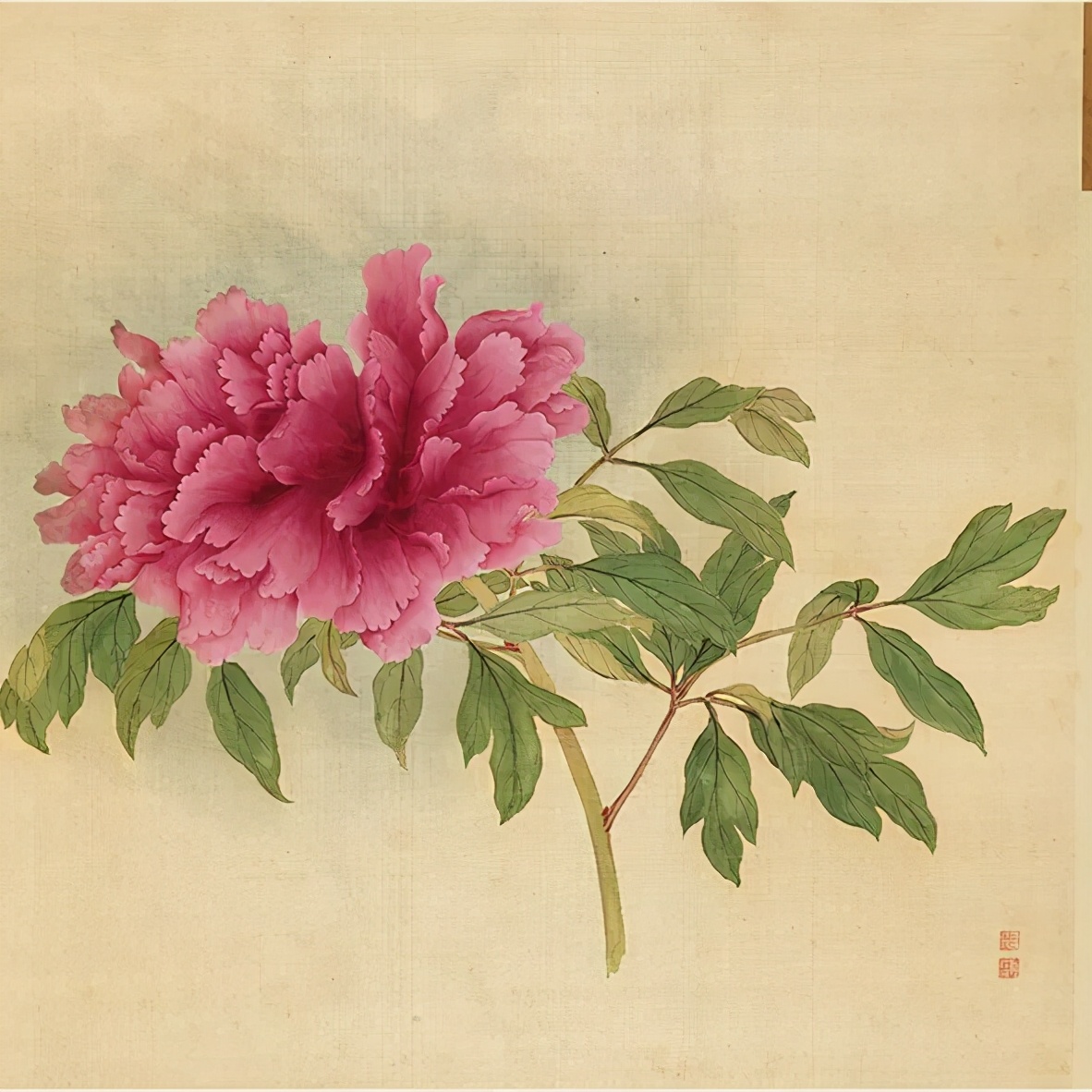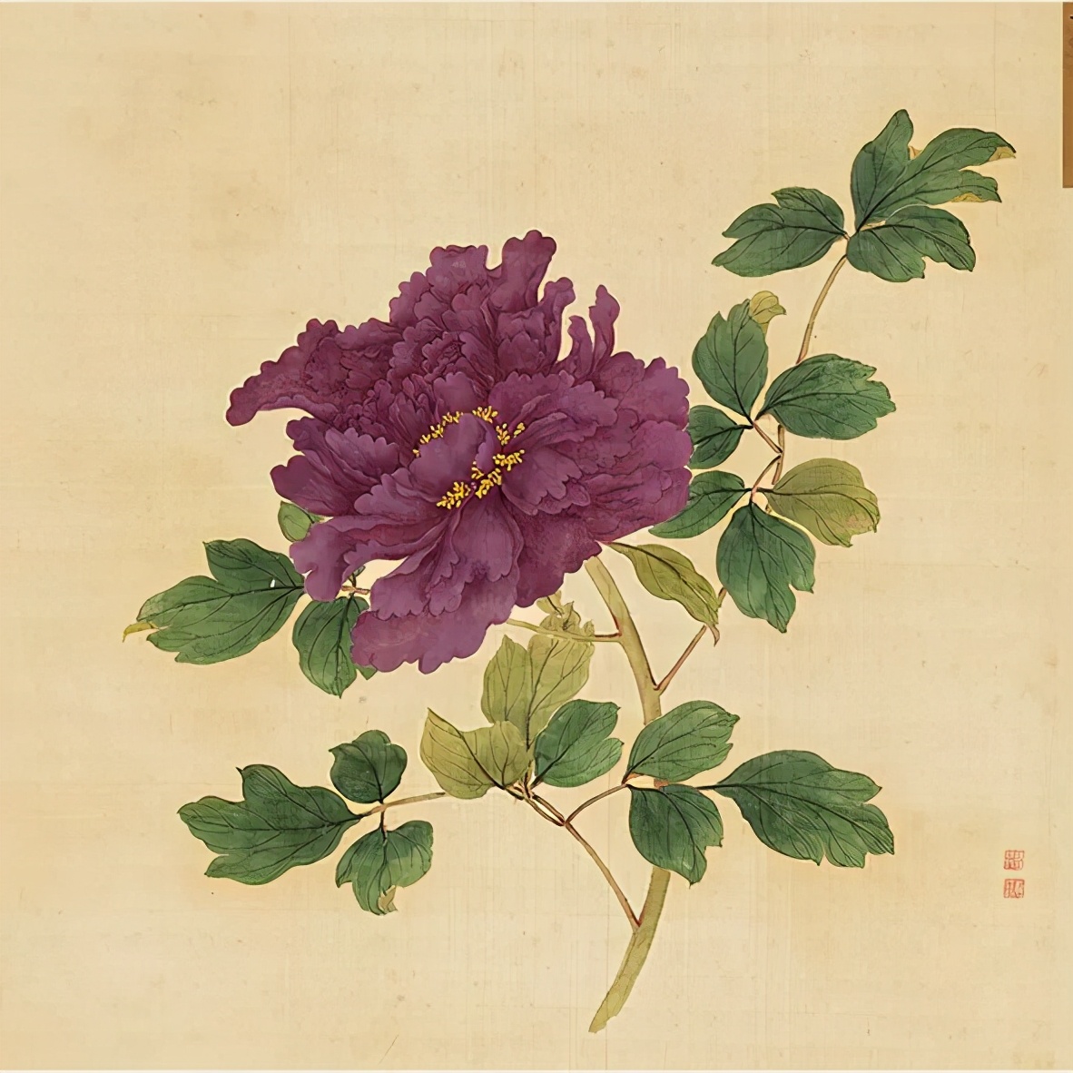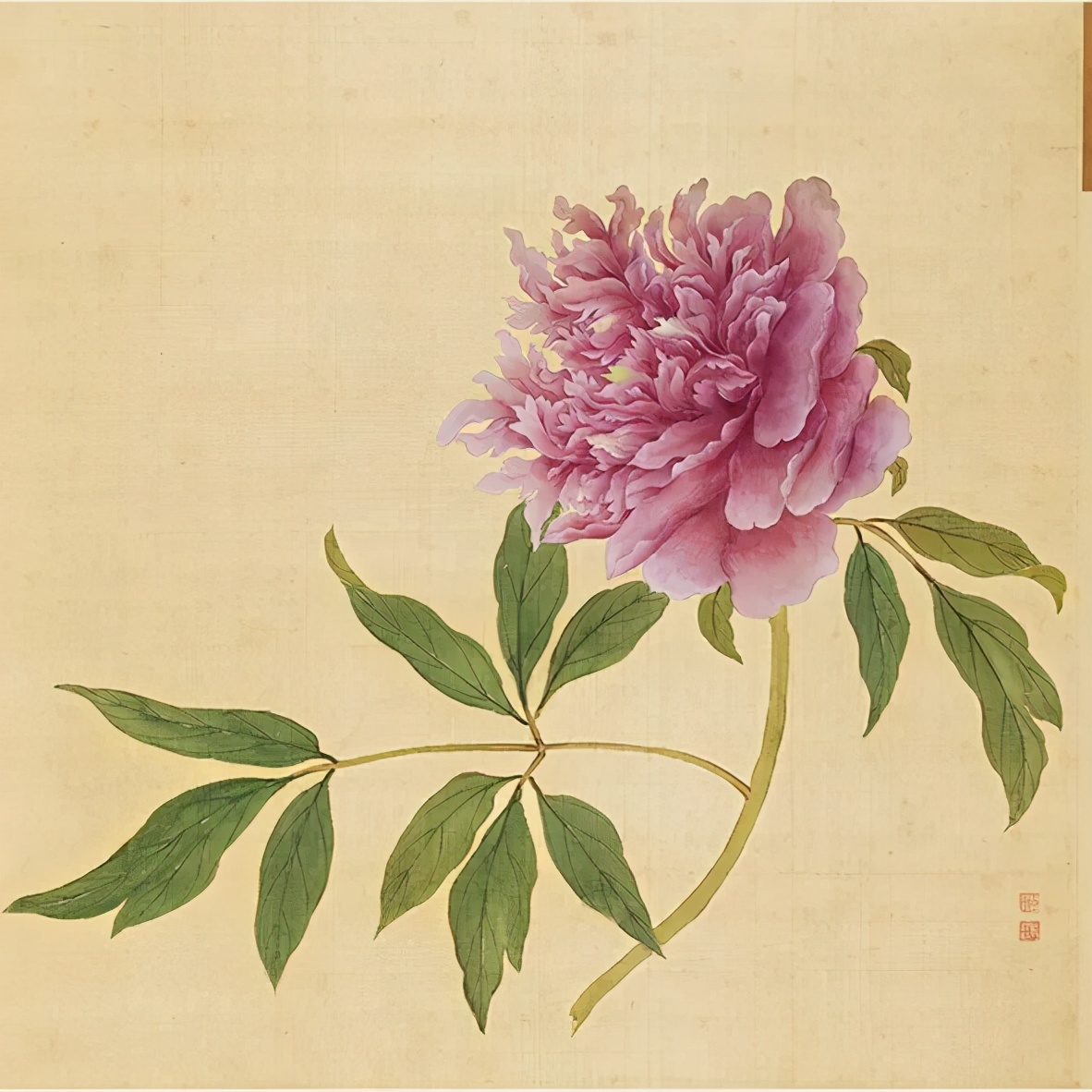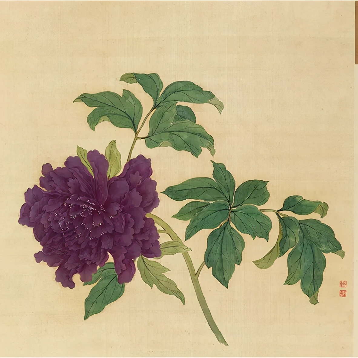 牡丹叶多为没骨法,色彩调和好之后用笔以此勾染而成,等画面干了再用线去勾勒茎脉部分。