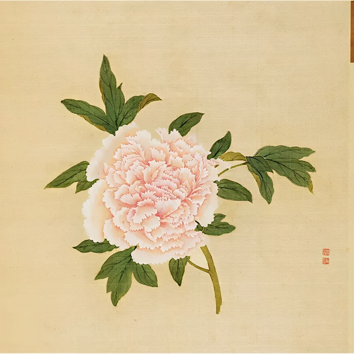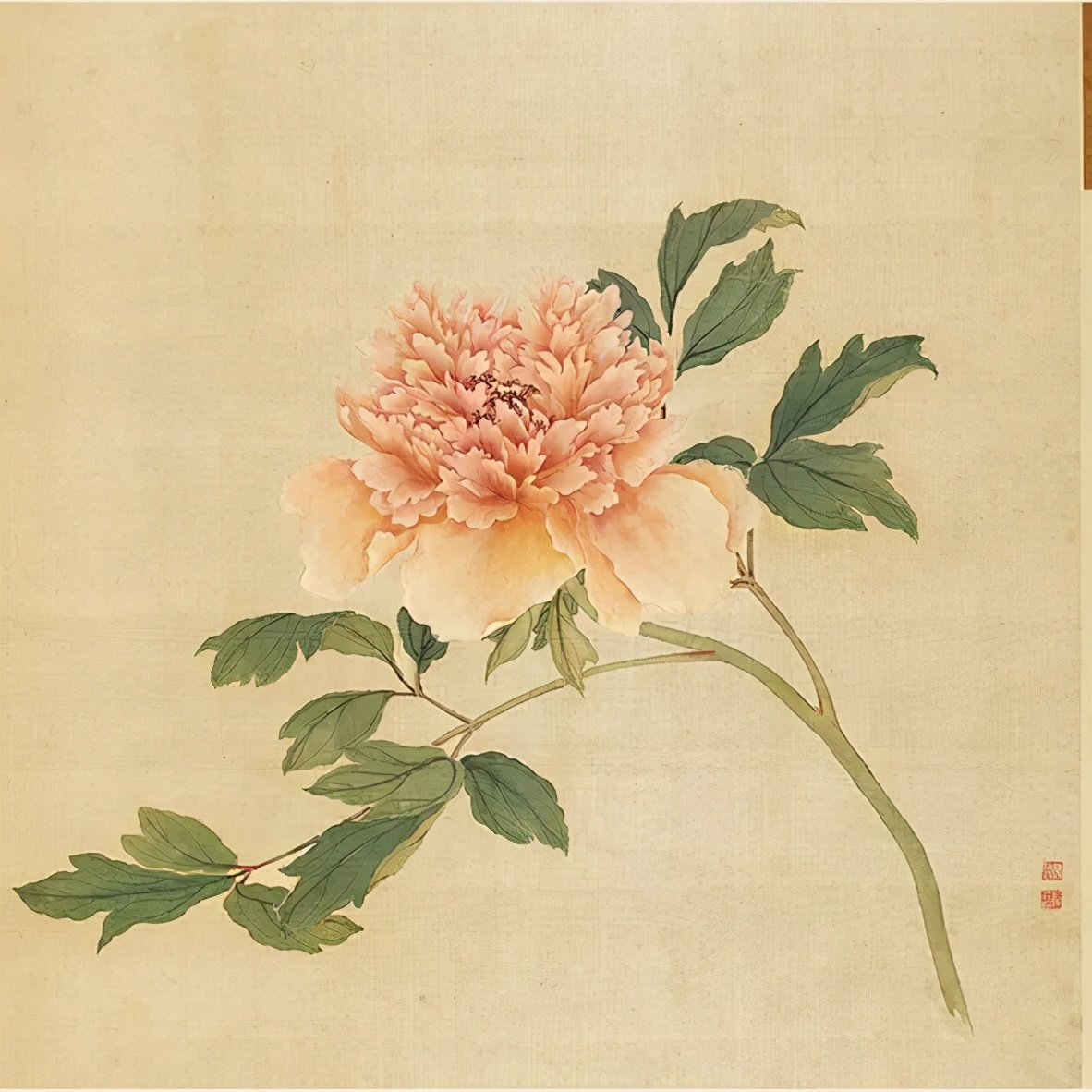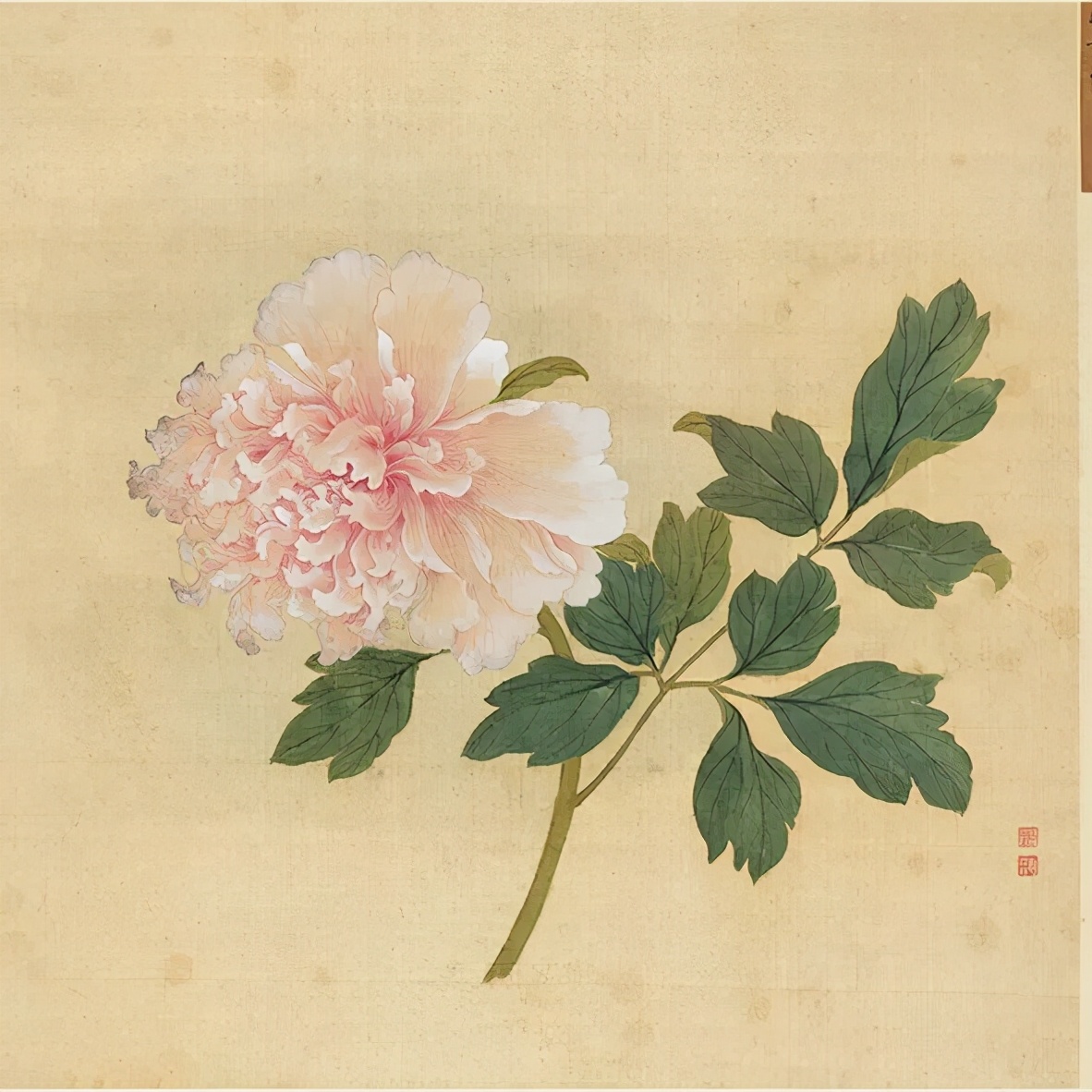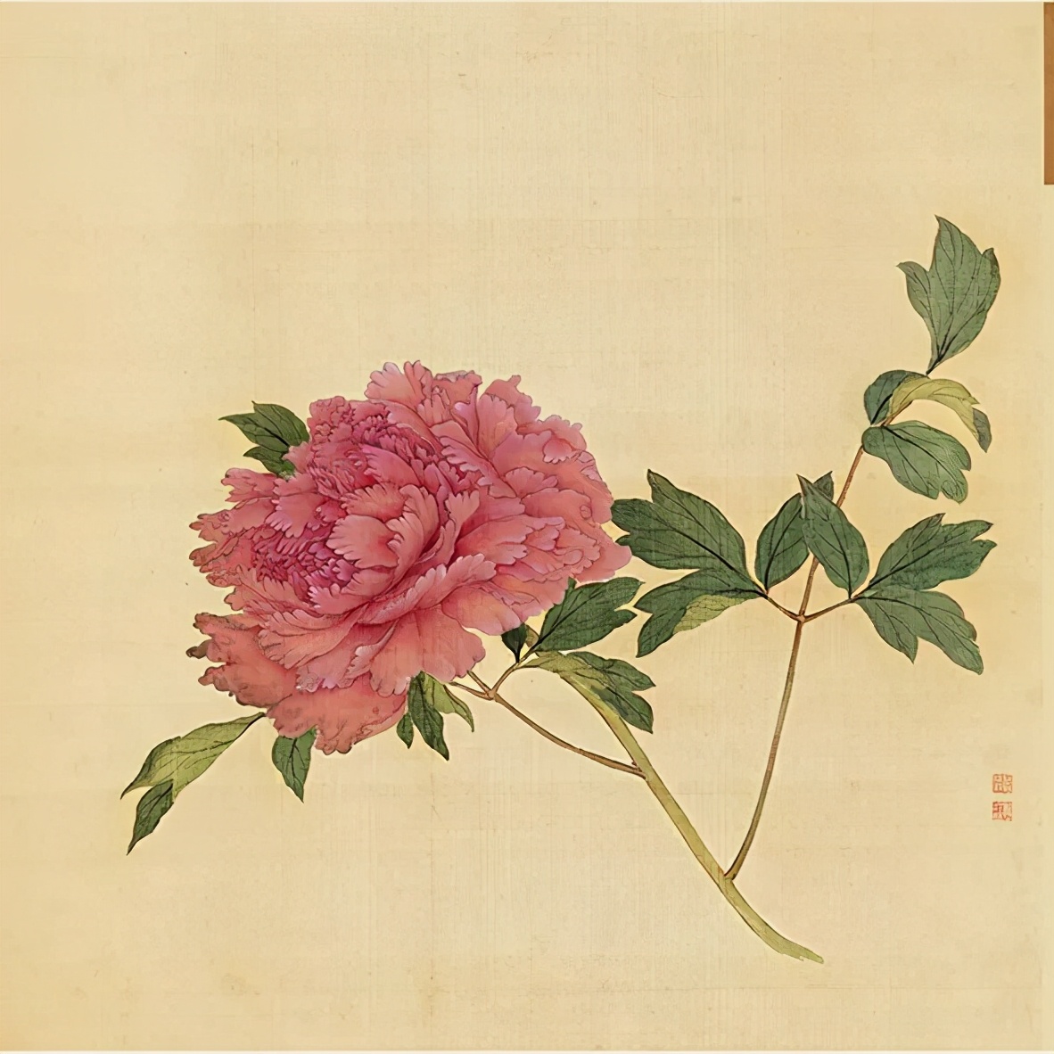 牡丹叶多为没骨法,色彩调和好之后用笔以此勾染而成,等画面干了再用线去勾勒茎脉部分。