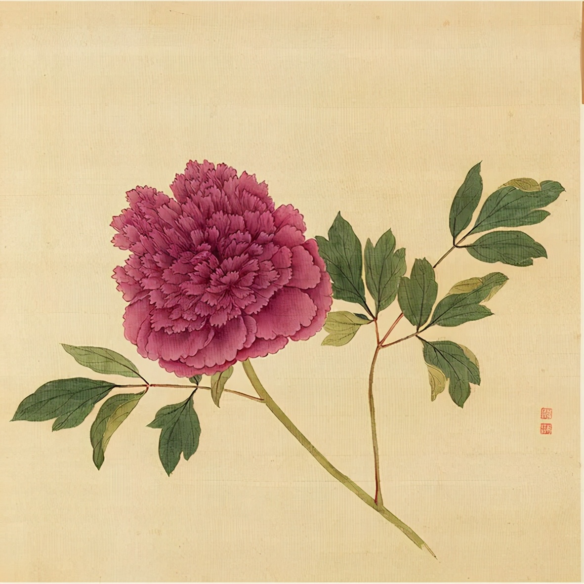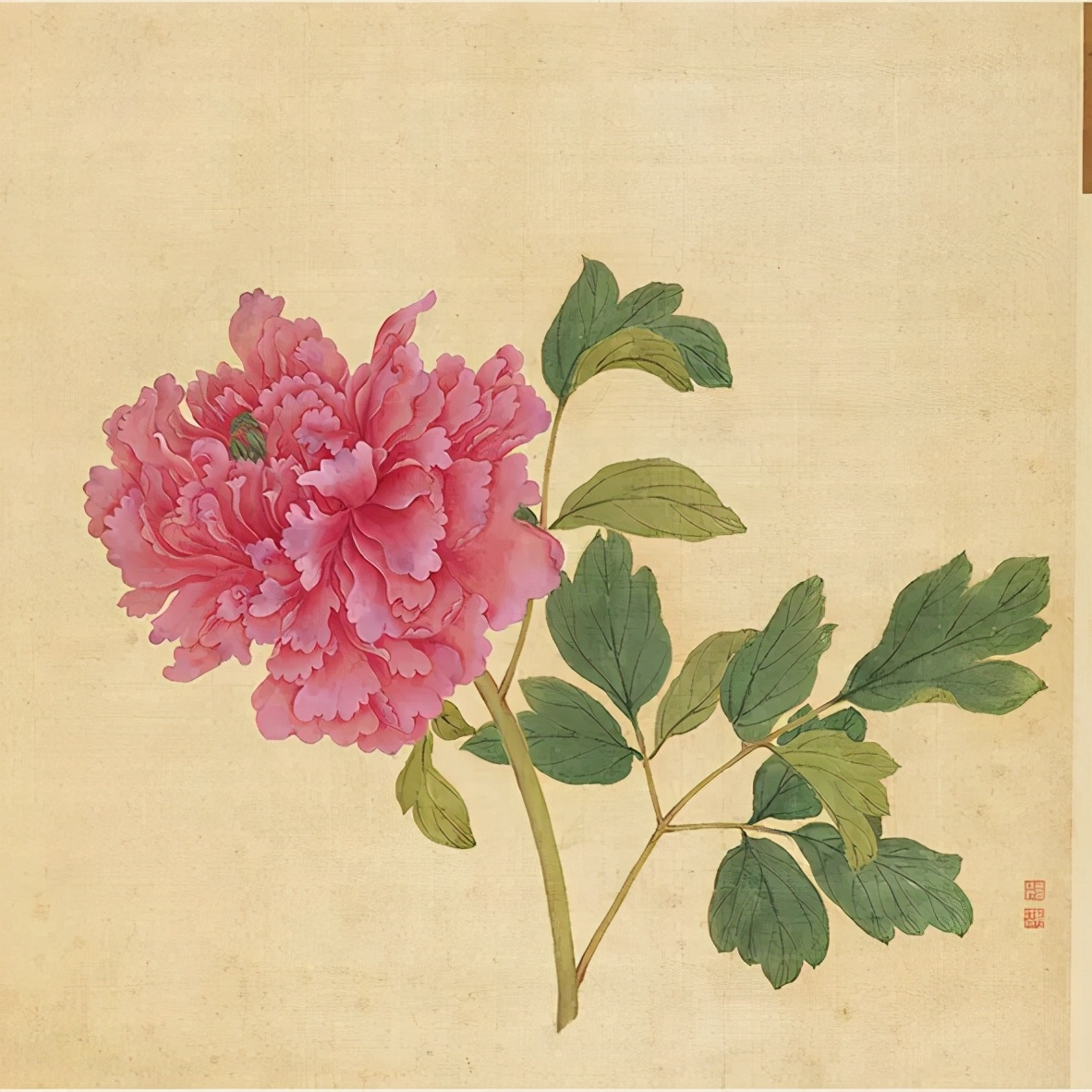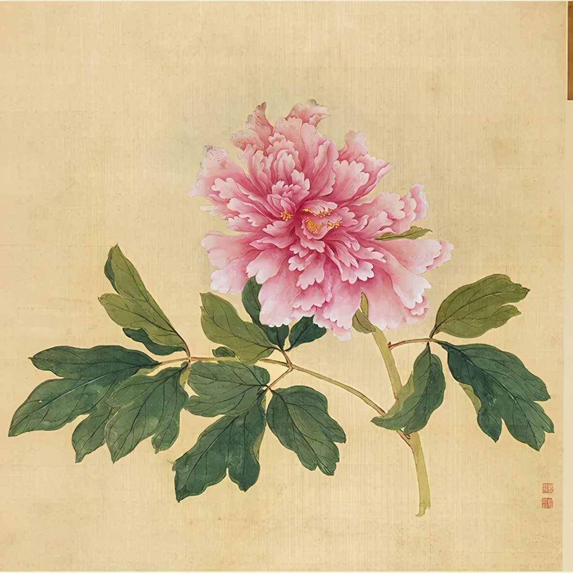 《百种牡丹谱》以绢本着色,当中绘一百种牡丹,总共分为四册,分别用元、亨、利、贞来标明,每册绘有牡丹二十五种。当中牡丹形态各异,似随风摇曳,一百种都是折枝牡丹,以一枝花位于画面视觉焦点,牡丹叶子也是阴阳向背,写实效果非常明显。也有一枝上有两朵牡丹的,一左一右,一大一小,互相交织。