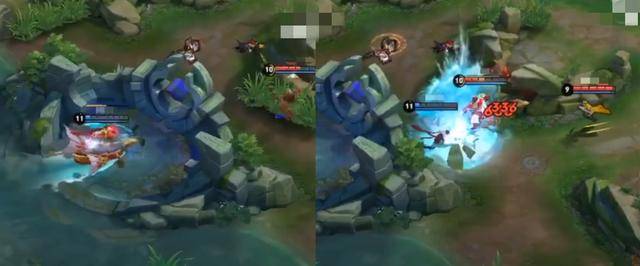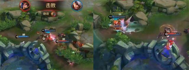 在图中的对战中,孙策击杀了对面的鬼谷子,面对没有辅助帮助的输出刘备,孙策想要一同收割。但是此时的孙策已经残血,对于射手的爆炸伤害显然已经支撑不住,所以还是决定开了大招迅速逃跑。刚好此时队友露娜前来援救,阻断了刘备的追击,不过砍了刘备一刀的露娜并不打算和他对抗,直接走开了。