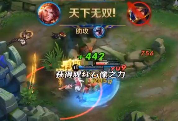 此时刚过河道的孙策,却突然转弯,这是要做什么?原来孙策看见被露娜打掉了护盾的刘备,就像回去报个仇。趁着大招还没有结束,孙策从主宰基地穿墙而过,正好撞上刚躲入草丛的刘备。大招的击飞伤害再加上孙策的技能劈砍,很快就被击杀。敌方张良及时到场也晚了一步,想要控住孙策但是被他二技能冲锋躲过,没有吧发伤害的张良就这样被击杀。