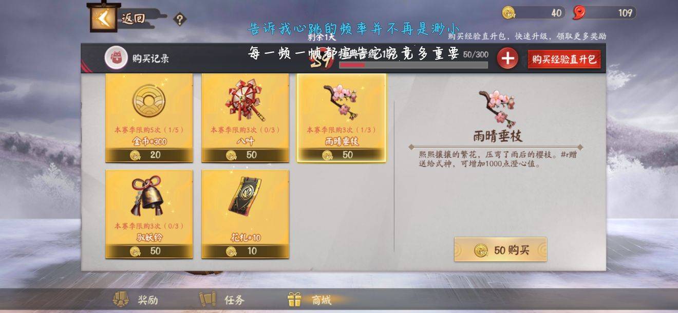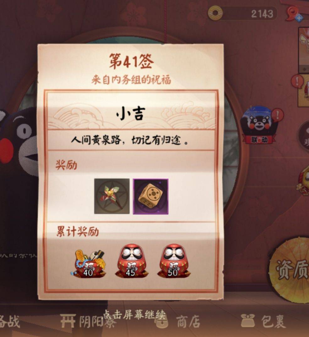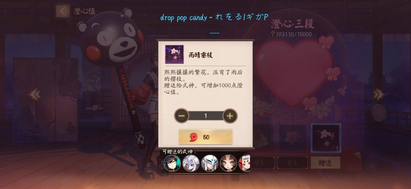 其他的途径责需要天时或者氪金,可在一些活动内获得礼物(例如这次的熊本熊联动收账),神龛用纸签和绘马有几率抽出礼物。买皮肤也可以增加澄心,不过具体数值不知