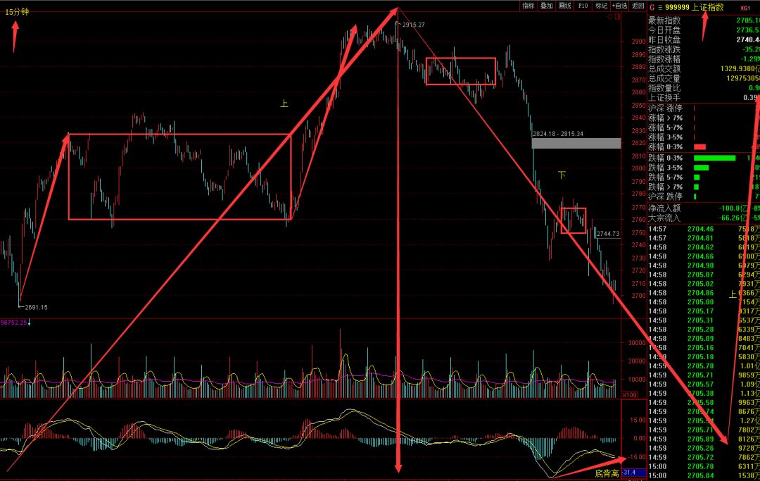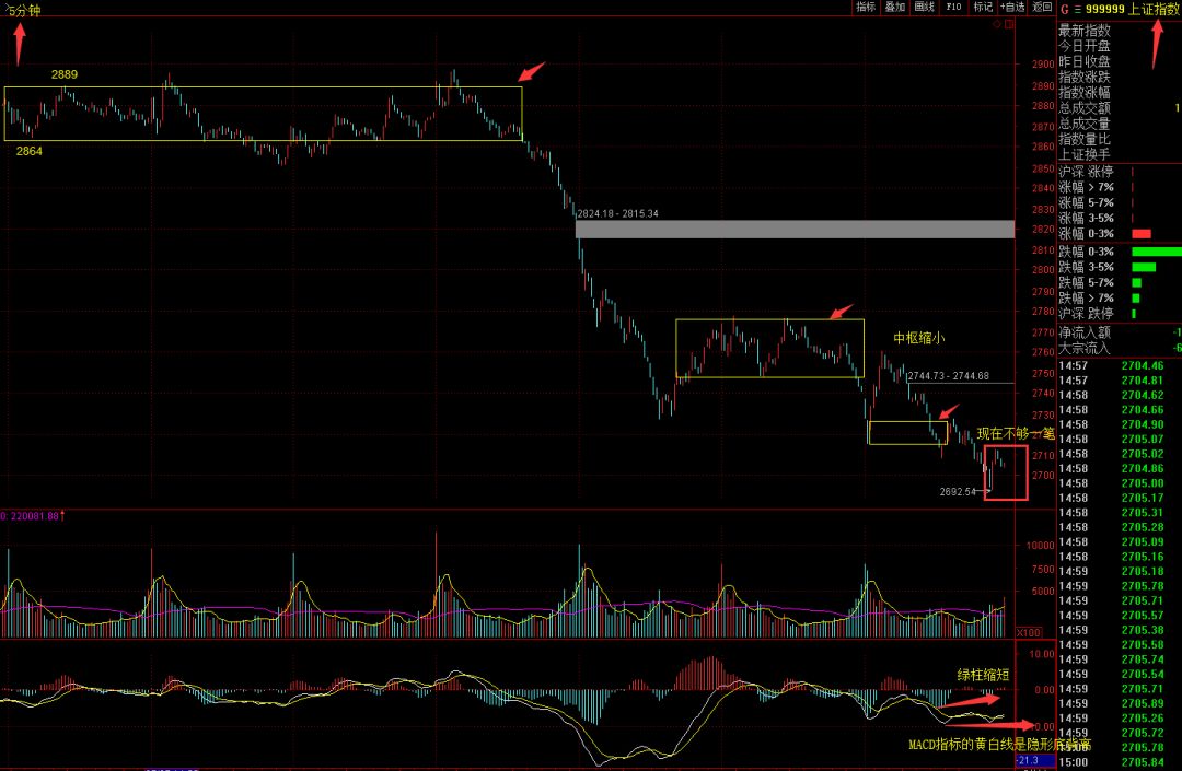上证指数:上证指数今日小幅低开,开盘下探后强势拉升反弹,但再度出现震荡回落的走势,午后延续弱势,前期强势股补跌明显。上证指数5分钟,下跌中枢在逐渐缩小,不是同级别,这种走势在3128-2691这段下跌出现过,下跌中枢越来越小,随时可以反转;今日5分钟MACD指标在2692点不创新低,MACD指标的黄白线持平,是隐形底背离,下跌绿柱明显缩短,有底背离迹象,但2692点到今天收盘还不够一笔,明日观察,若2692点开始的上涨够一笔(笔:一个底分型加一个顶分型+一根独立的K线),可以抄底;15分钟,2691到2915是一笔上,2915到现在是一笔下,后市会有一笔上,且15分钟出现底背离,明天可以在5分钟形成底背离时抄底。