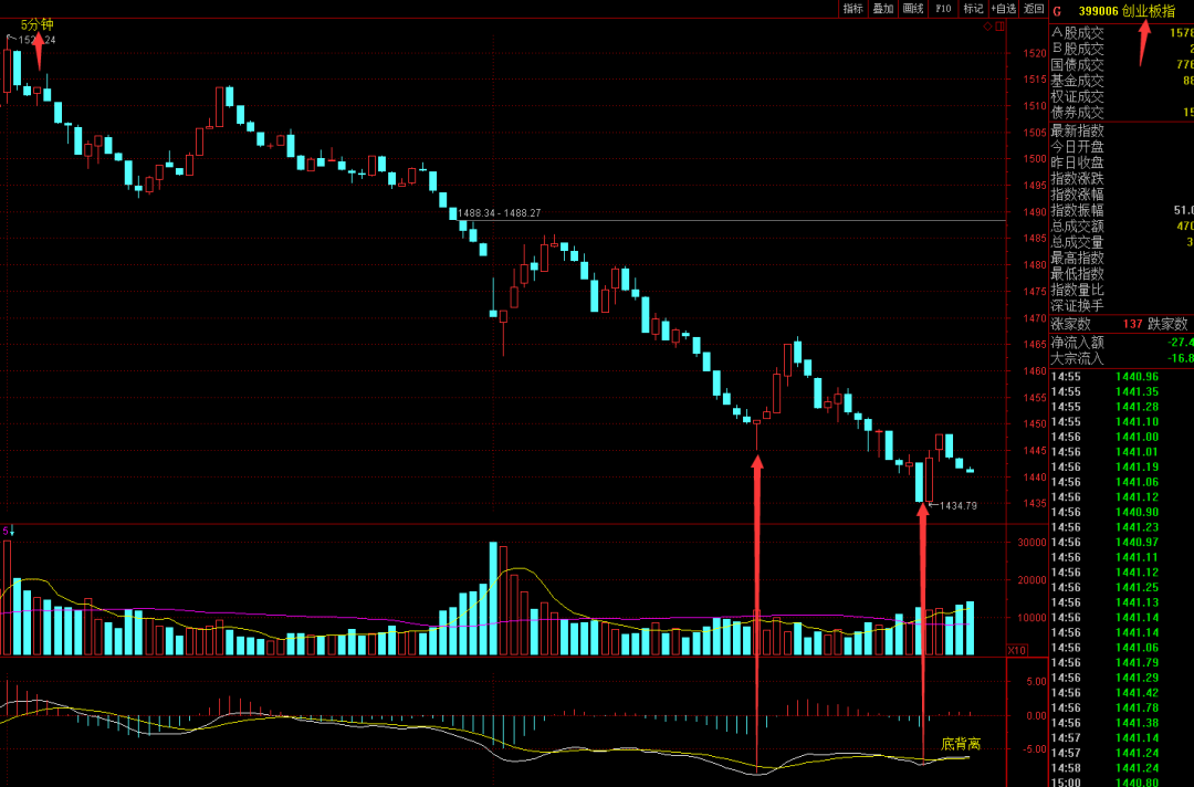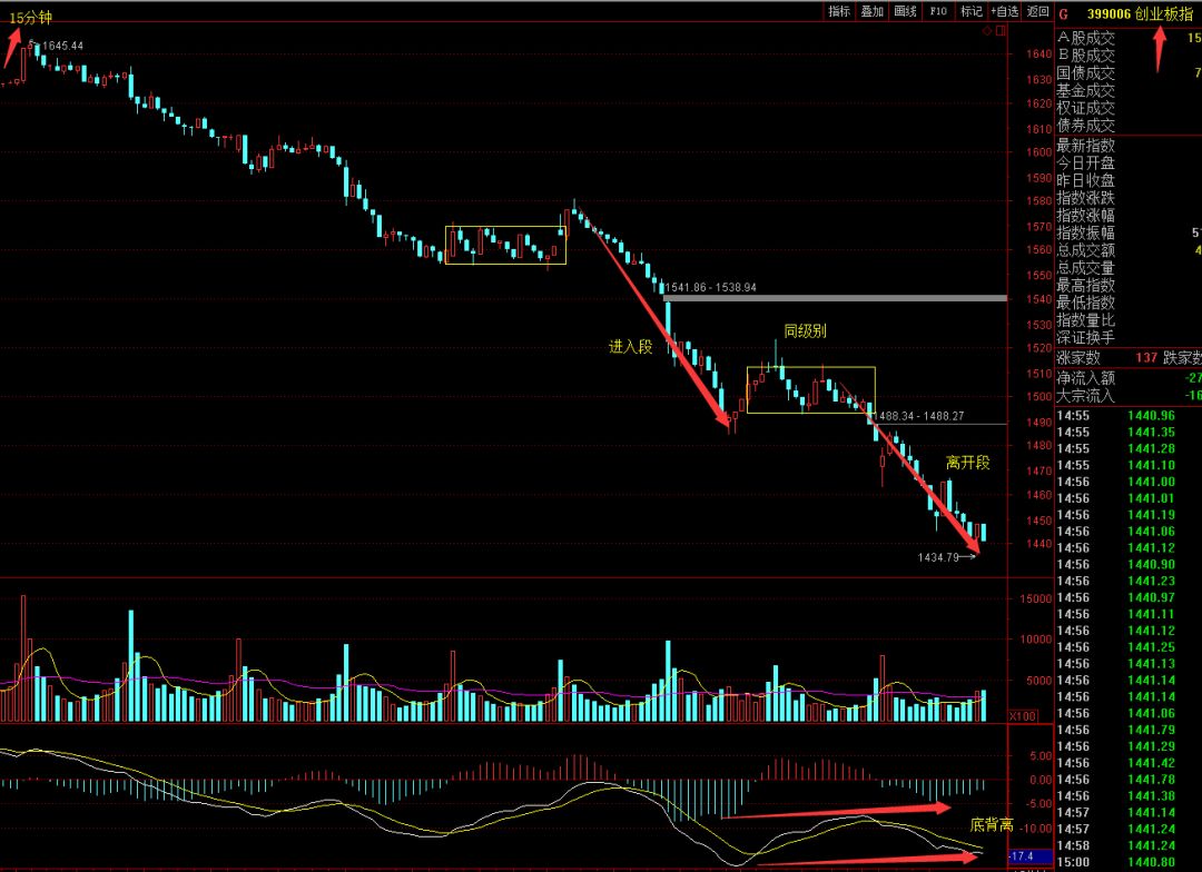 创业板指:创业板指15分钟1918点开始的下跌是同级别(5分钟)趋势下跌,第二个中枢的进入段下跌力度明显比离开段强,发生背驰的概率较大;简单的可以看15分钟MACD指标的黄白线不创新低,绿柱缩小,出现底背离;5分钟,今日在1434点出现一次底背离,明日观察底背离若成立,可以抄底。