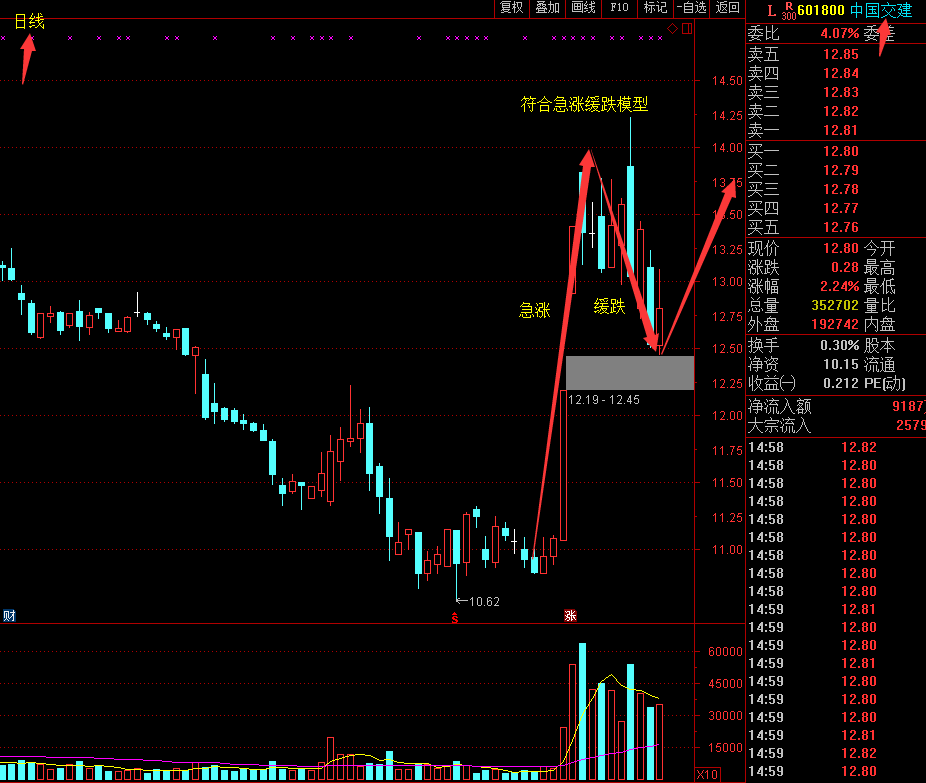 2、留意个股:中国交建(601800),该股符合急涨缓跌模型。