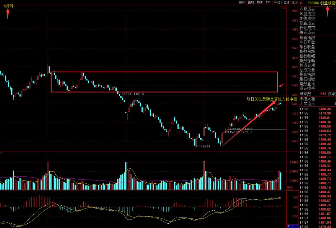 创业板指:创业板指今日弱于上证指数,5分钟反弹没有进入前中枢,明日关注反弹能否进入前中枢。