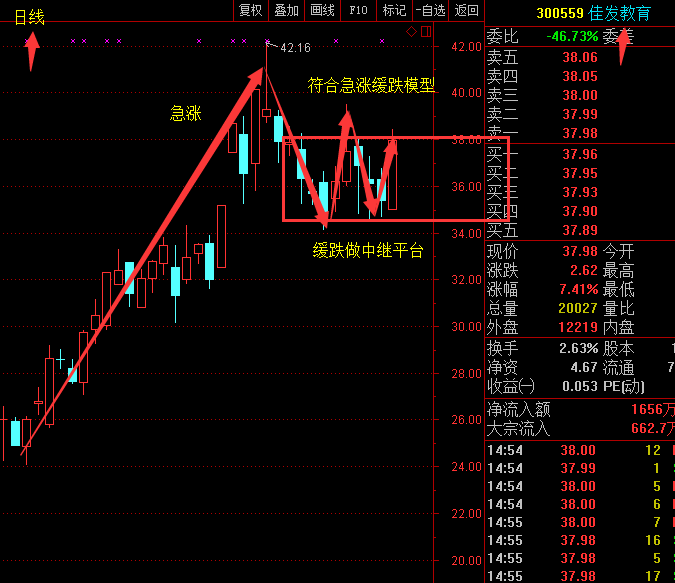 2、留意个股:佳发教育(300559),该股符合急涨缓跌模型。