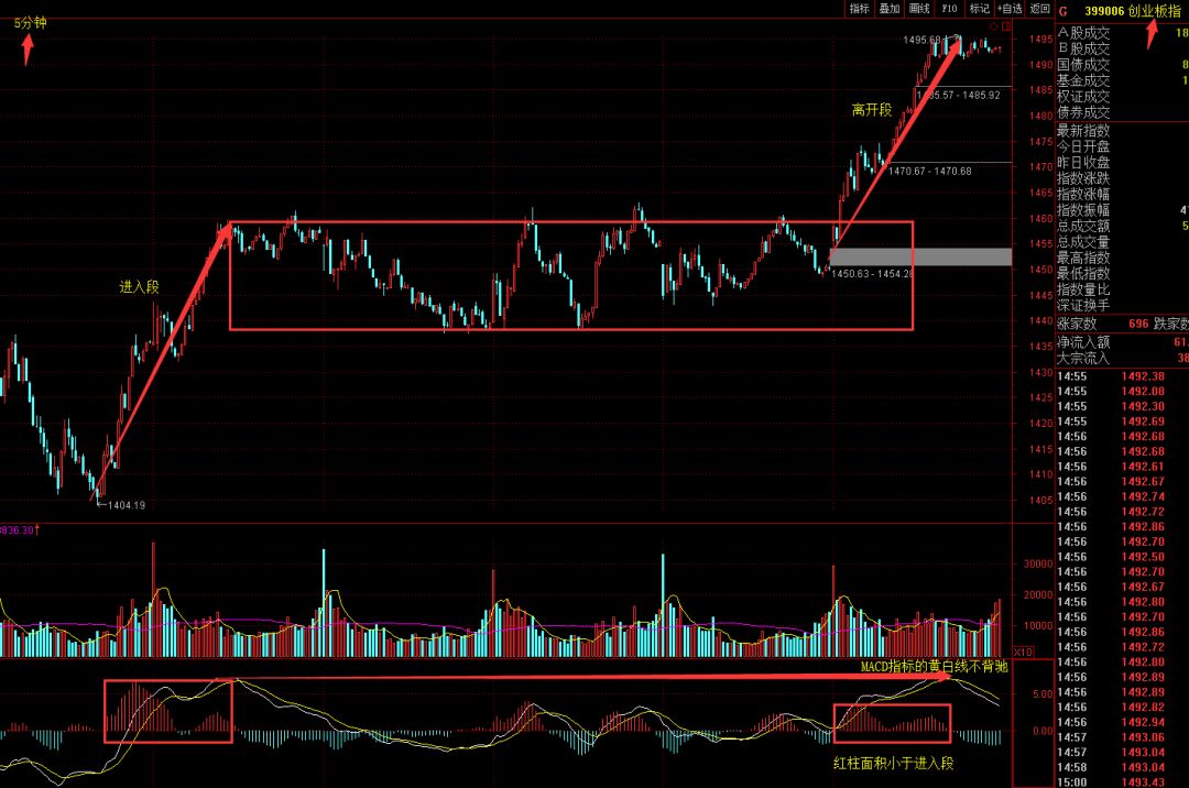 创业板指:创业板指5分钟上周没有出现离开段,今日走出离开段,目前离开段MACD指标的黄白线高度与进入段持平,不背驰,红柱面积小于进入段,可以关注5分钟回调能否形成三买。