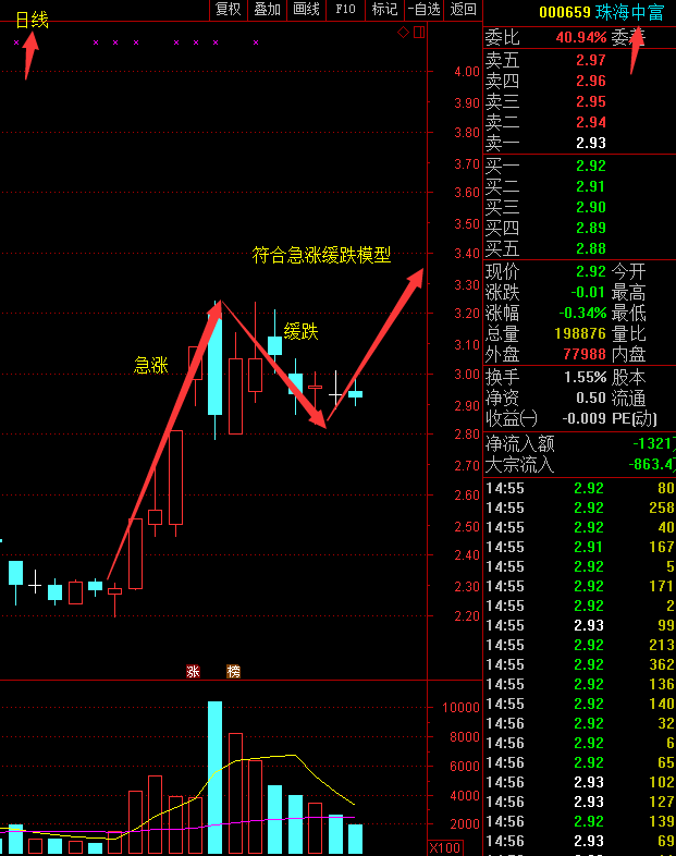 2、留意个股:珠海中富(000659),该股符合急涨缓跌模型。