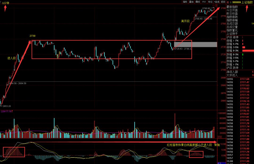 上证指数:今日上证指数跳空高开,随后呈现单边上涨走势,以5G为首的题材板块展开反弹,个股全线飘红,做多情绪回暖,赚钱效应逐步回升。上证指数5分钟离开段MACD指标的红柱面积和黄白线高度都小于进入段,5分钟出现背驰,是卖点;上周五5分钟出现离开段,但离开段又打回原中枢,今日的上涨形成有效的离开段。后市关注5分钟能否形成三买,5分钟下跌不破2739点,构成一笔,出现底分形,是三买。