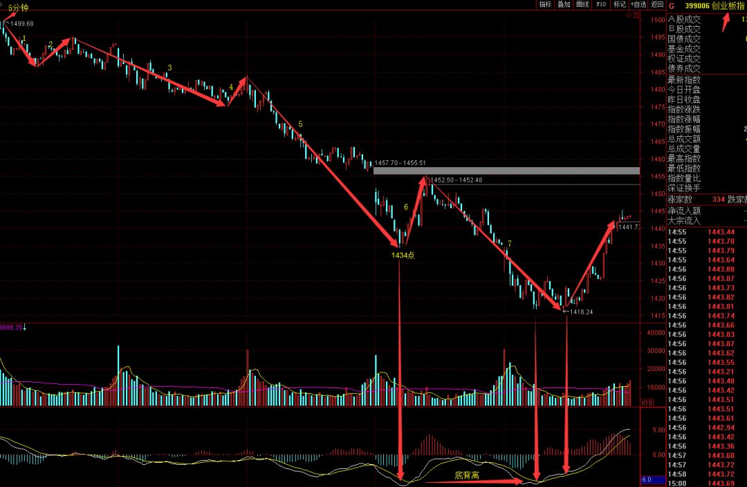 创业板指:创业指数今日跌破1434点,5分钟形成线段背驰,后市关注能否构筑5分钟中枢,形成5分钟盘整背驰。