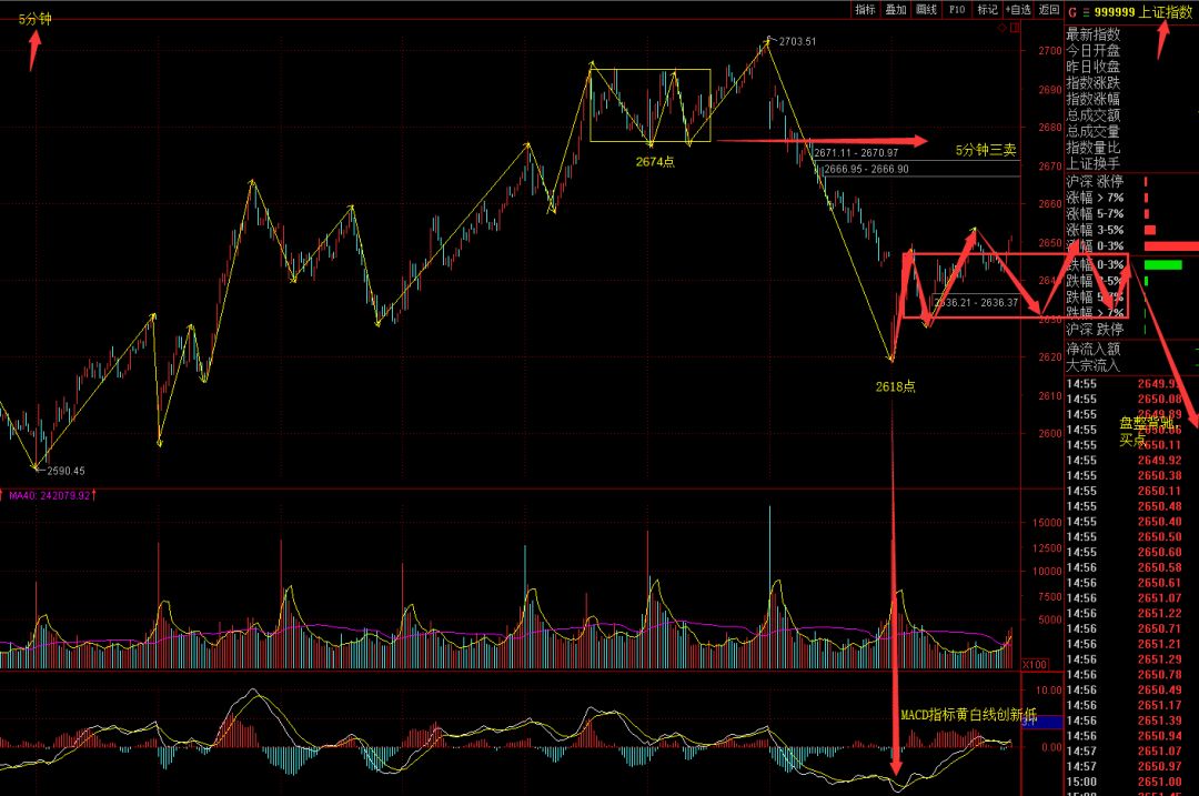上证指数:今日受外围股市影响,上证指数低开,随后回补低开缺口,但上涨力度较弱;创投板块持续分化,弘业股份、贤丰控股等个股封跌停,物流板块表现较活跃,但市场缺乏领涨热点,市场观望情绪仍旧浓厚。上证指数今日低开,5分钟MACD指标的黄白线创新低,下跌力度较大,虽然一笔急涨回补了今日的跳空缺口,但MACD指标没有出现底背离,反弹不触及2674点,5分钟三卖的风险仍然存在;5分钟有可能从2618点开始构筑一个5分钟中枢,然后再跌破2618点,出新低,离开段出现背驰,背驰才是买点。