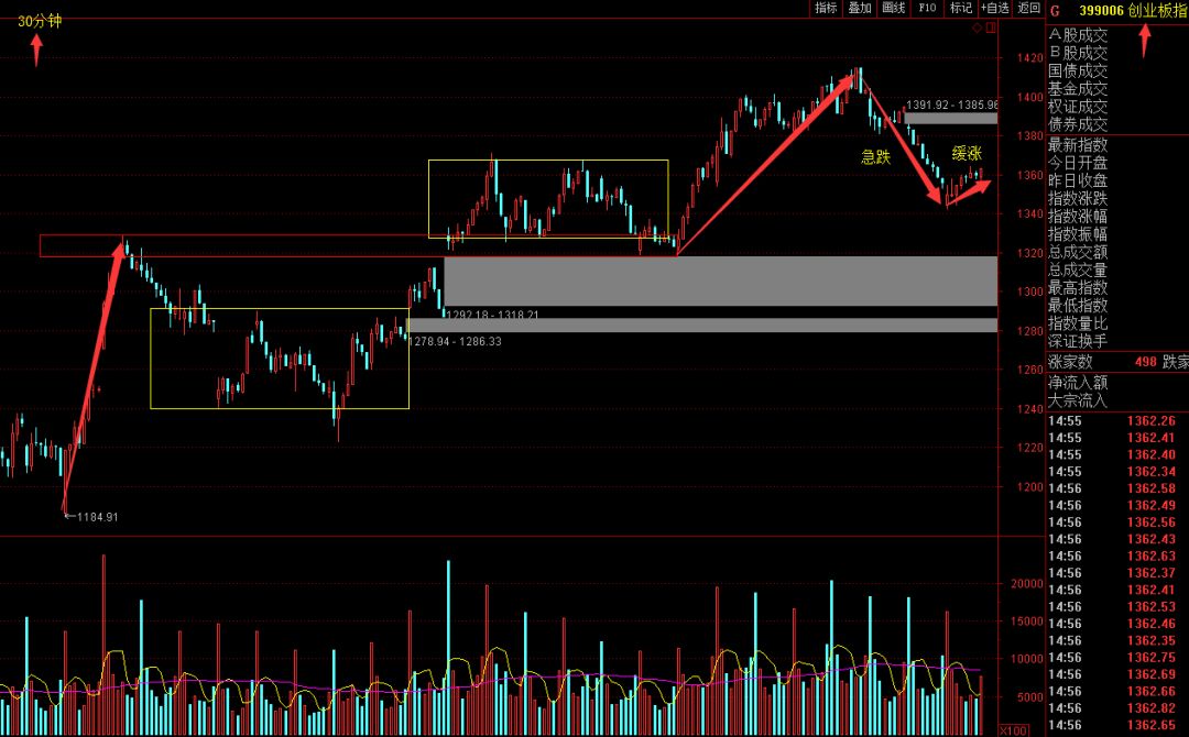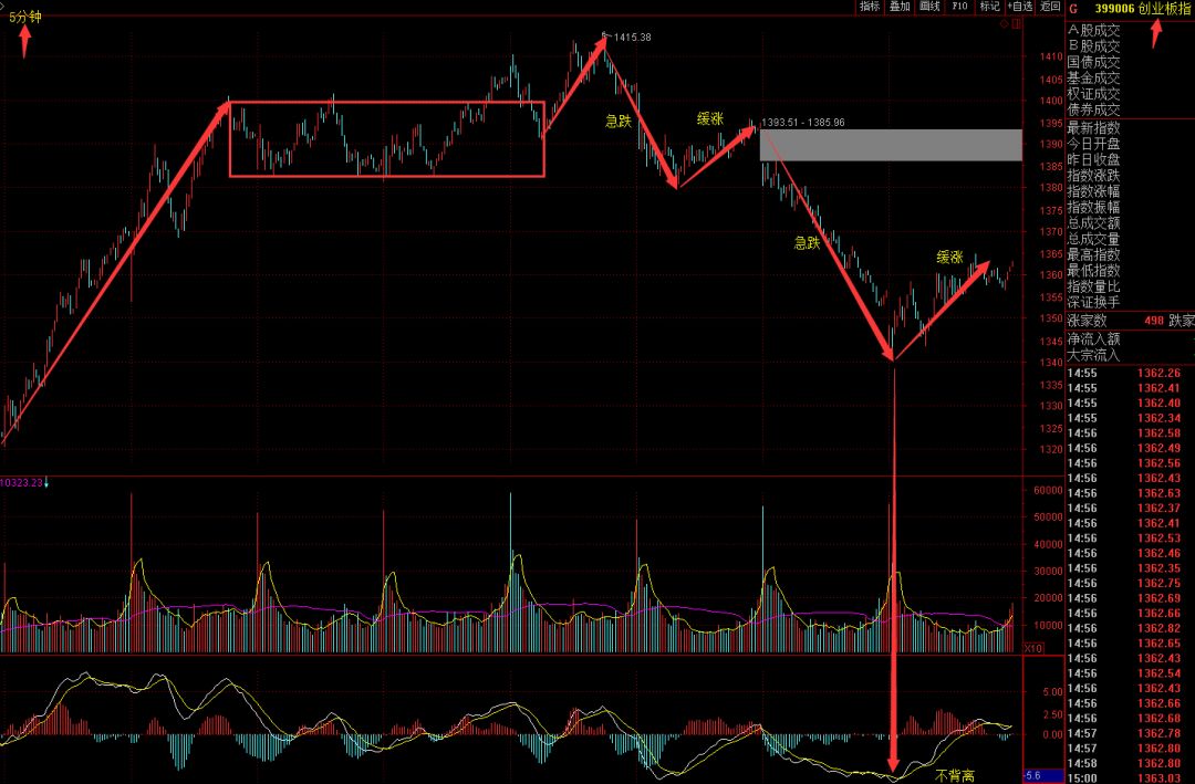 创业板指:创业板指5分钟从1415点开始出现两次急跌缓涨结构,后市要防下跌;反弹不触及1382点,是5分钟三卖;目前5分钟下跌不背驰,MACD指标没有底背离,下跌没有结束。创业板指30分钟同上证指数,也是急跌缓涨形态,后市要防再次下跌。