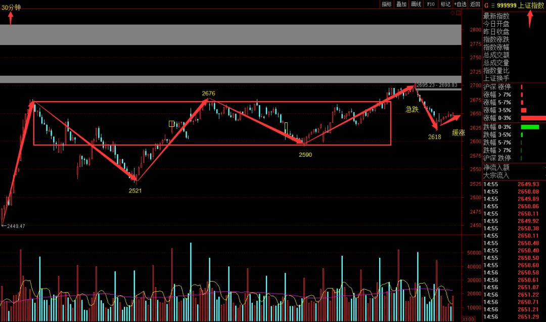 上证指数30分钟,2695到2618是急跌,2618到现在是缓涨,急跌缓涨后市要防下跌。