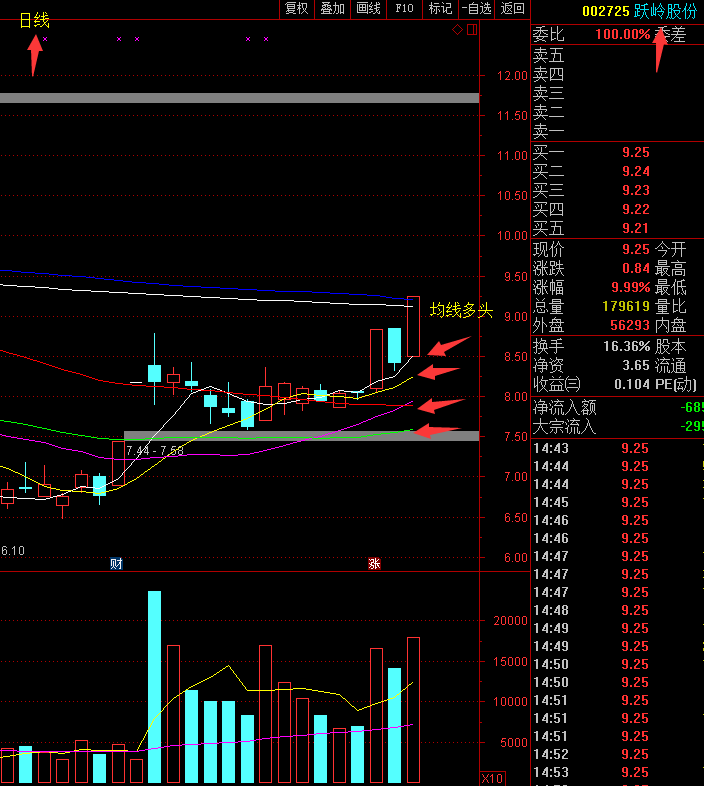 2、留意个股:跃岭股份(002725),该股符合均线多头。