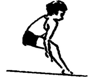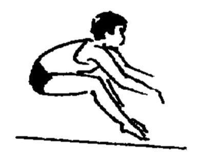 两臂自然前后预摆,同时两脚随着协调屈伸。当两臂从后向前上方做有力摆动时,两脚迅速蹬地,充分蹬伸髋、膝,踝关节向前跳起,使身体在空中成一斜线。