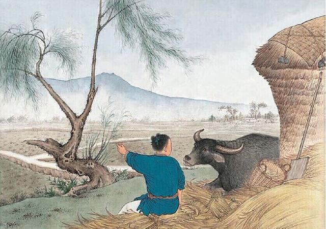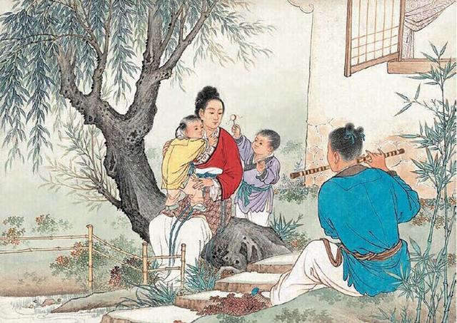9.天上才一日,人间已数年。牛郎织女先后生育了一男一女。劳动间隙,他们携儿带女在树下玩耍,共享天伦之乐。