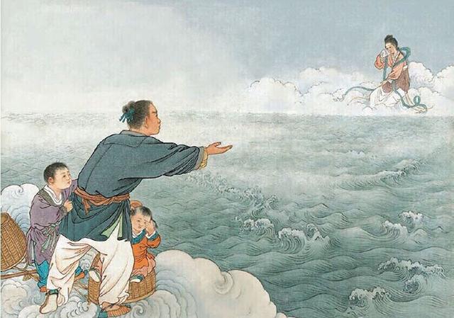 5.次日,牛郎来到瑶池,果见众仙女在水中嬉戏。其中一个姑娘愁眉紧锁,正是他日思夜想的织女。
