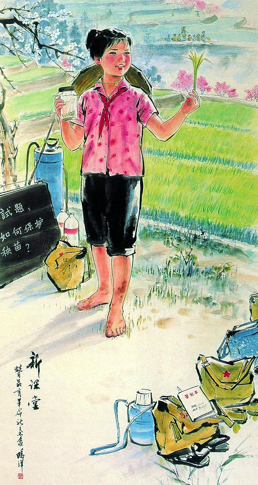 新课堂(国画)(立轴设色纸本)鸥洋 1974年