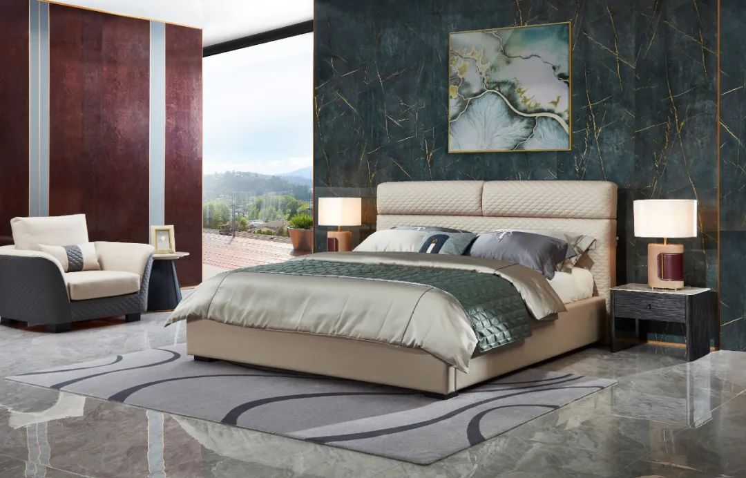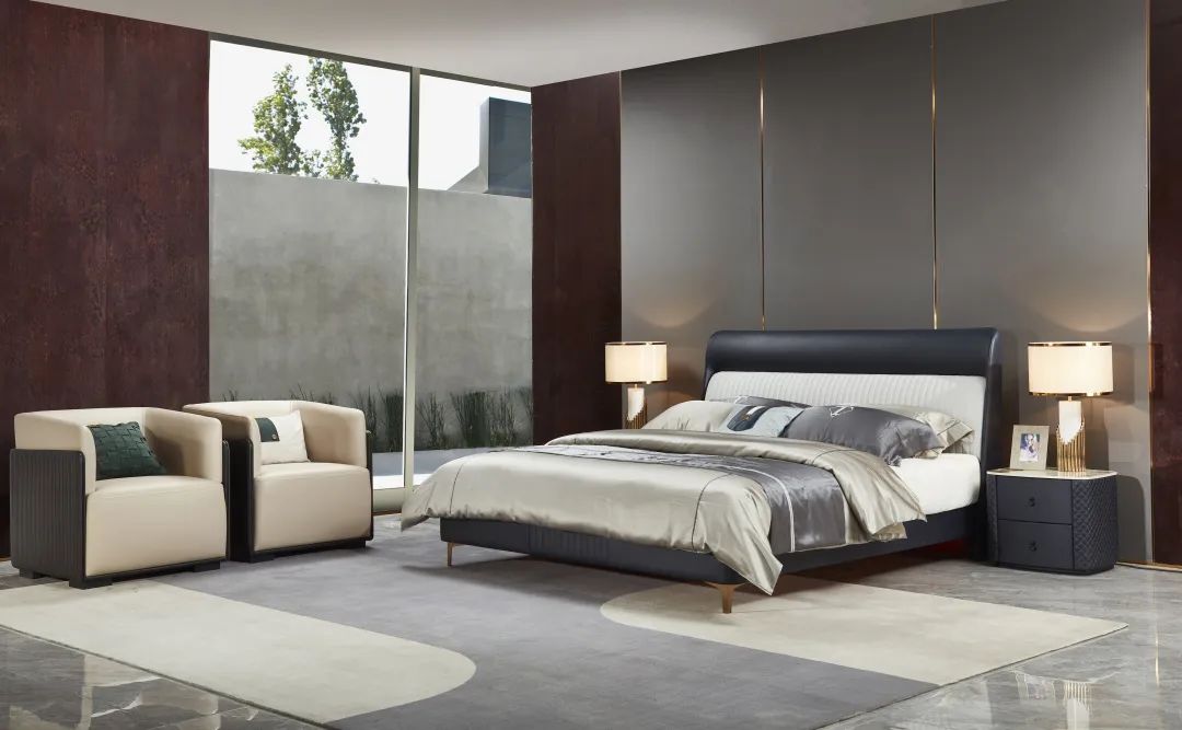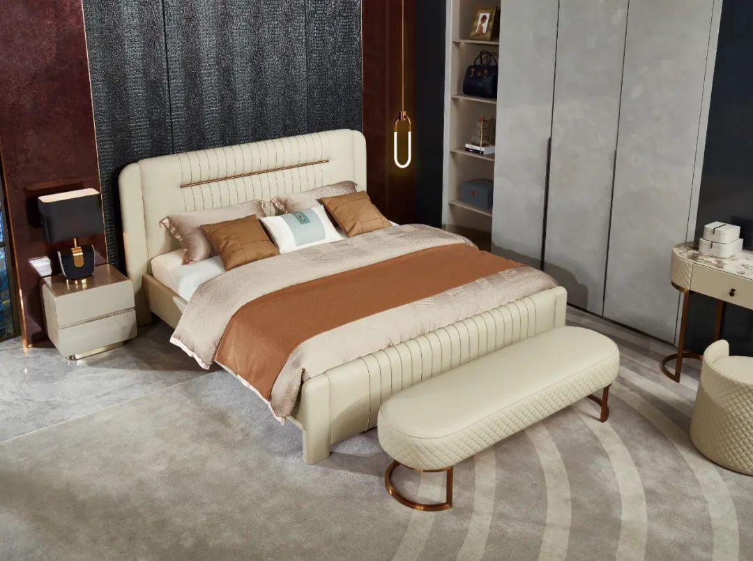 CBD家居·SHEAI | XS008软床,浅米咖色淡雅十足,奠定空间的浪漫风情,造型别致的靠包,线条设计与床尾呼应,内嵌金属条,彰显精致工艺。