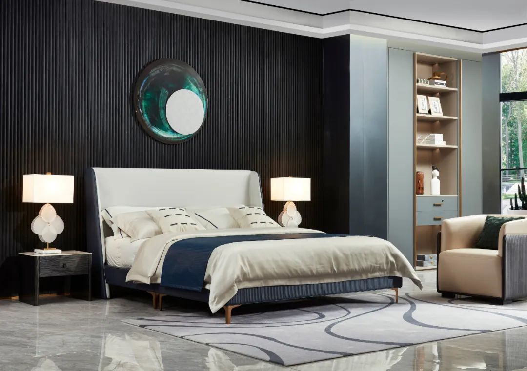 CBD家居·SHEAI | XS013软床,深灰蓝色冷静自持,作为软床的外围色凸显沉稳感,一体式落地床屏,折耳半包裹设计是于细节处传达轻奢质感,五金细长脚,增强空间的通透性。