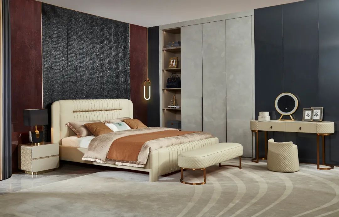 卧室中,轻奢风需要在平衡奢与雅的同时,营造“静”的氛围,用色上避免高饱和度色,选用驼色、棕色、象牙白等中性色,更多几分温馨与优雅。