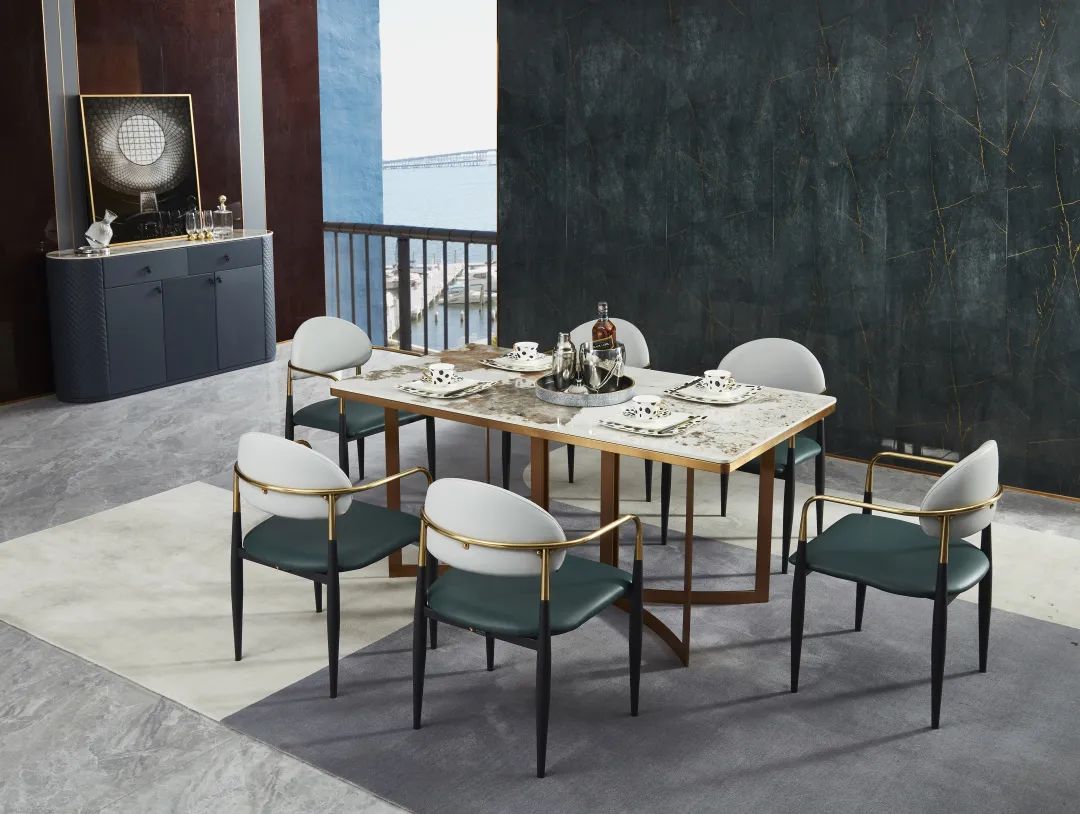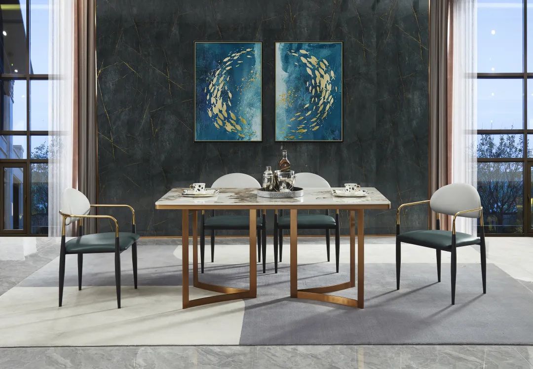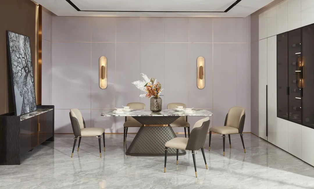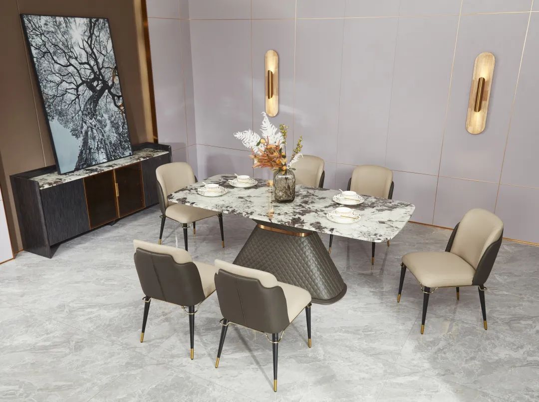 其次就是餐桌的选择,CBD家居·SHEAI | XS001餐台,潘多拉岩板将金色、白色、灰色融注一体,更显轻奢气质。