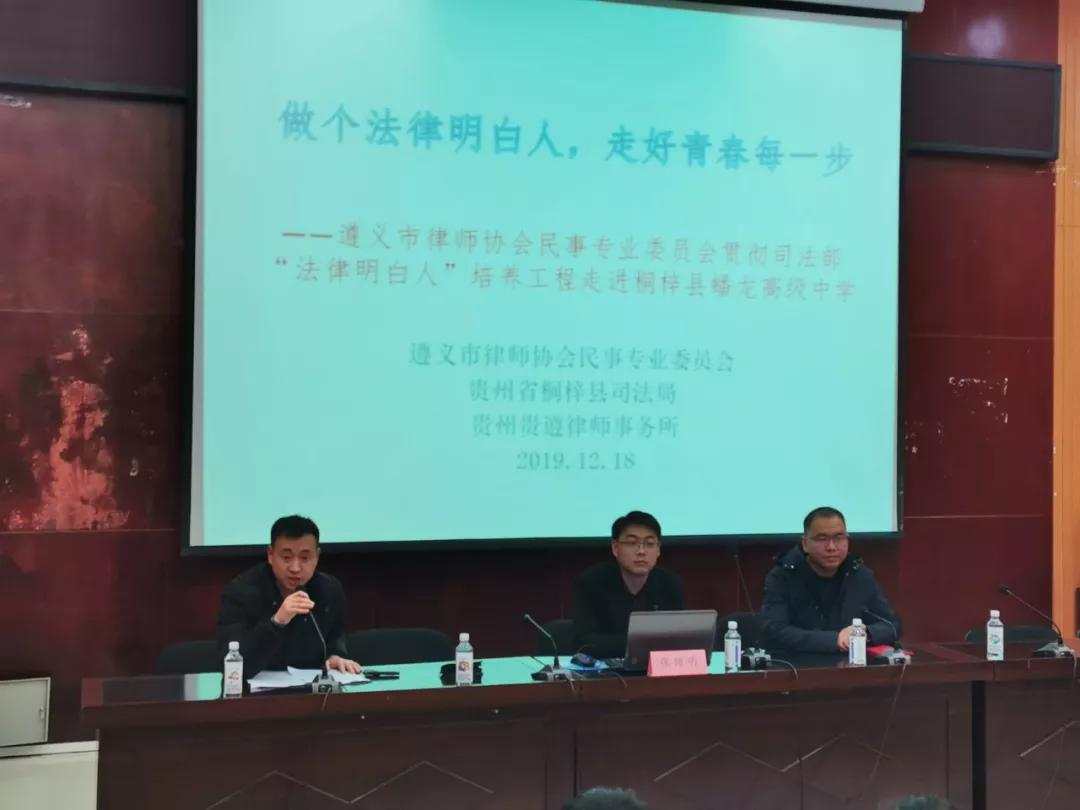 新闻事件说明:2019年12月18日,遵义市律师协会民事专业委员会、桐梓县司法局、贵州贵遵律师事务所组织律师,联合深入桐梓县蟠龙高级中学,开展“法律明白人”培养工程进校园,法治宣讲教育活动,正式启动司法部提出的“法律明白人”培养工程计划。。