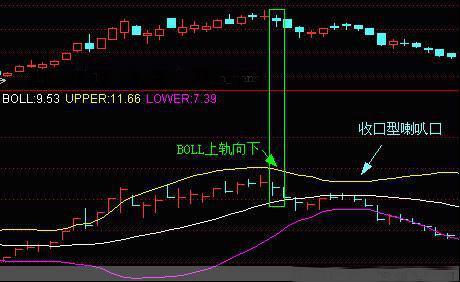 当股价经过短时间的大幅拉升后,布林线的上轨线和下轨线逐渐扩张,上下轨线之间的距离越来越大,随着成交量的逐步减少,股价在高位出现了急速下跌的行情,此时布林线的上轨线开始急速掉头向下,而下轨线还在加速上升,这样布林线上下轨之间的形状就变成一个类似于倒的大喇叭的特殊形态,我们把布林线的这种喇叭口称为收口型喇叭口。收口型喇叭口是一种显示股价短线大幅向下突破的形态。它是形成于股价经过短时期的大幅拉升后,面临着向下变盘时所出现的一种走势。布林线的上下轨线出现方向截然相反而力度很大的走势,预示着空头力量逐渐强大而多头力量开始衰竭,股价将处于短期大幅下跌的行情之中。
