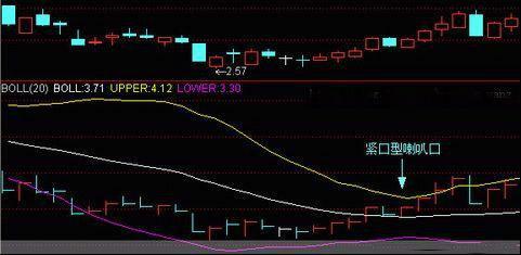 当股价经过长时间的下跌后,布林线的上下轨向中轨逐渐靠拢,上下轨之间的距离越来越小,随着成交量的越来越小,股价在低位的反复振荡,此时布林线的上轨还在向下运动,而下轨线却在缓慢上升。这样布林线上下轨之间的形状就变成一个类似于倒的小喇叭的特殊形态,我们把布林线的这种喇叭口称为紧口型喇叭口。紧口型喇叭口是一种显示股价将长期小幅盘整筑底的形态。它是形成于股价经过长期大幅下跌后。面临着调整的一种走势。布林线的上下轨线的逐步小幅靠拢,预示着多空双方的力量逐步处于平衡,股价将处于横盘整理的行情中。